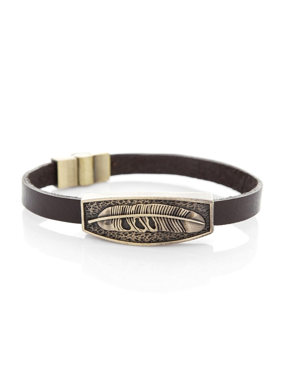 Keskeny barna bőr karkötő, keskeny fém díszítéssel indián motívummal.
