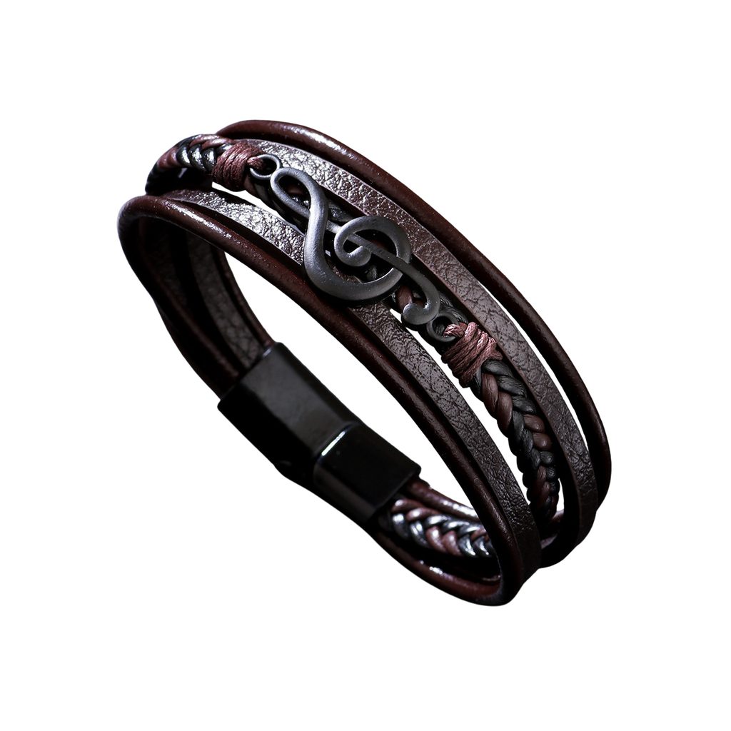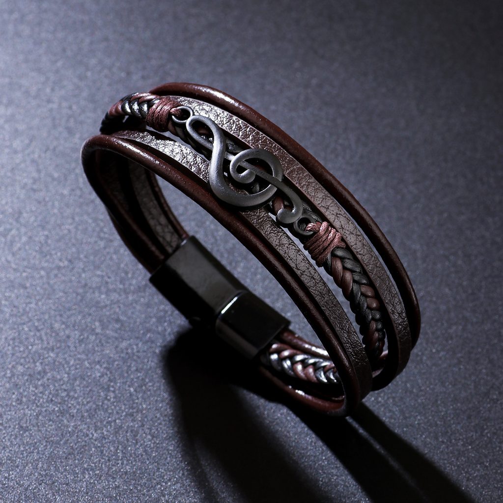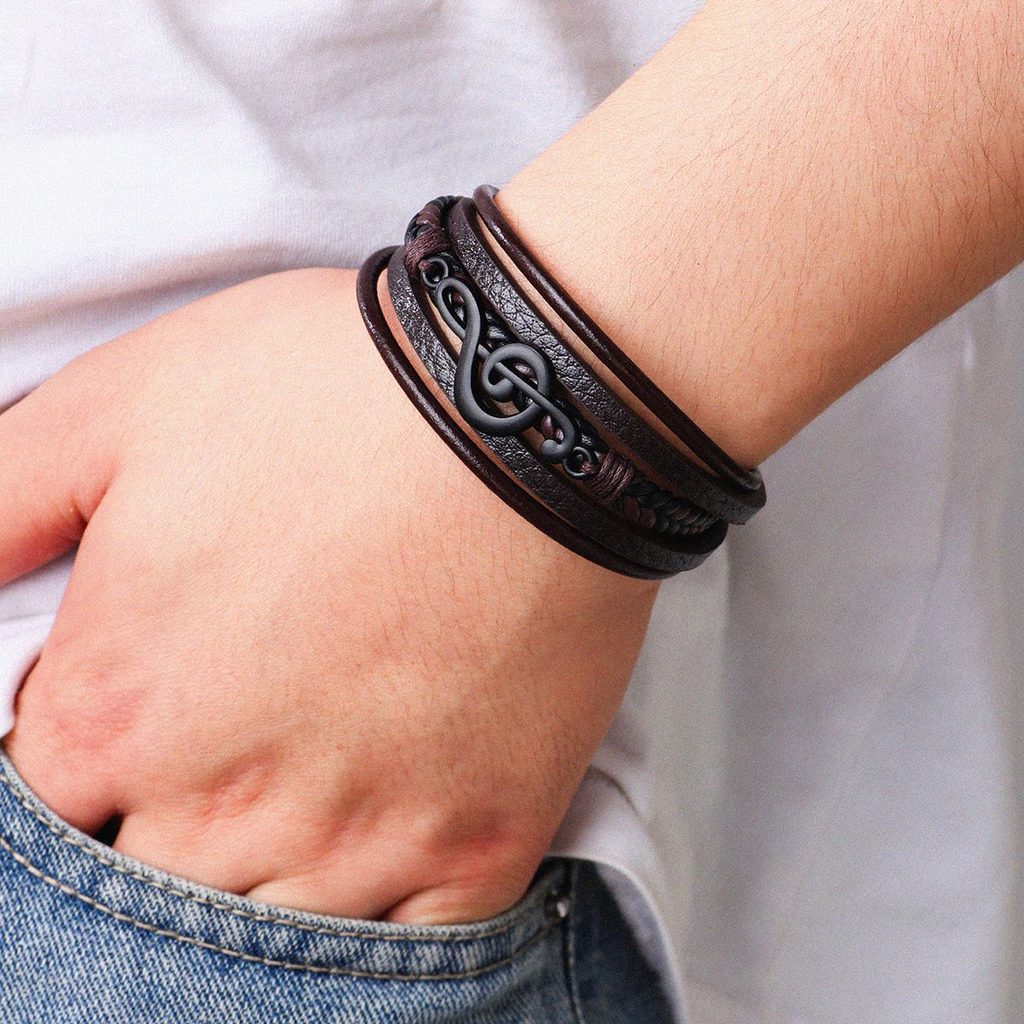 Stílusos férfi bőrkarkötő barna kivitelben eredeti, többrétegű kialakításával és hegedűkulcs alakú domináns részletével nyűgöz le. A sima és a fonott pántok kombinációja modern, mégis elegáns megjelenést eredményez, amely a mindennapi és alkalmi öltözékeket egyaránt kiegészíti. A karkötőt fekete fémkapocs zárja le, amely erőt és határozott férfias jelleget kölcsönöz neki. Ez a zenei motívummal ellátott férfi karkötő tökéletes választás azoknak a férfiaknak, akik szeretik a zenét, és eredeti részletet szeretnének hozzáadni stílusukhoz.