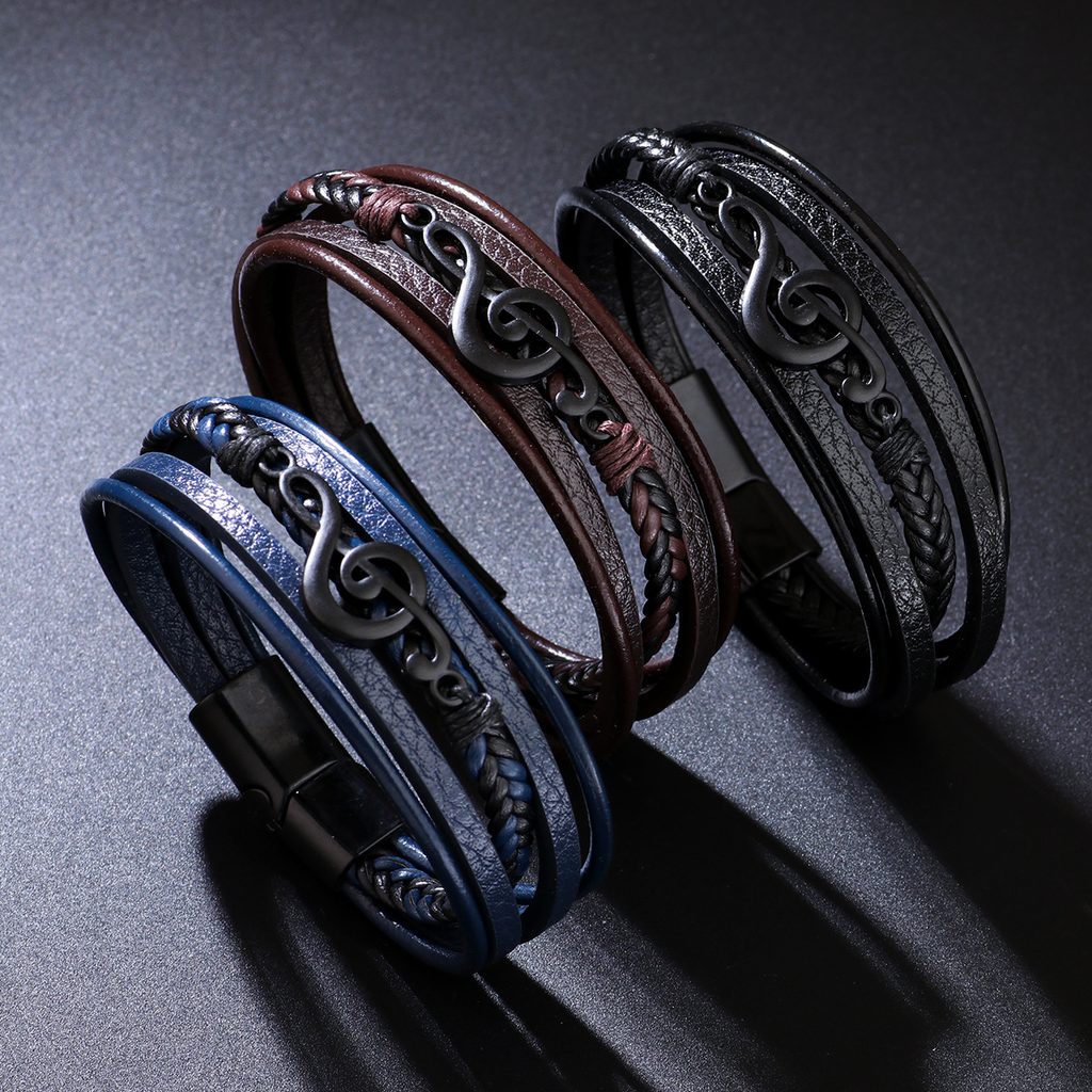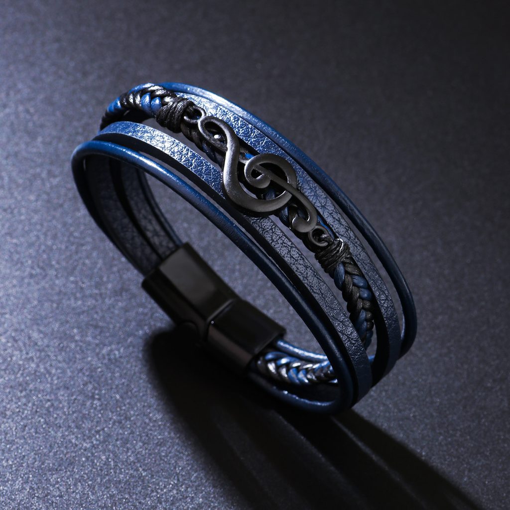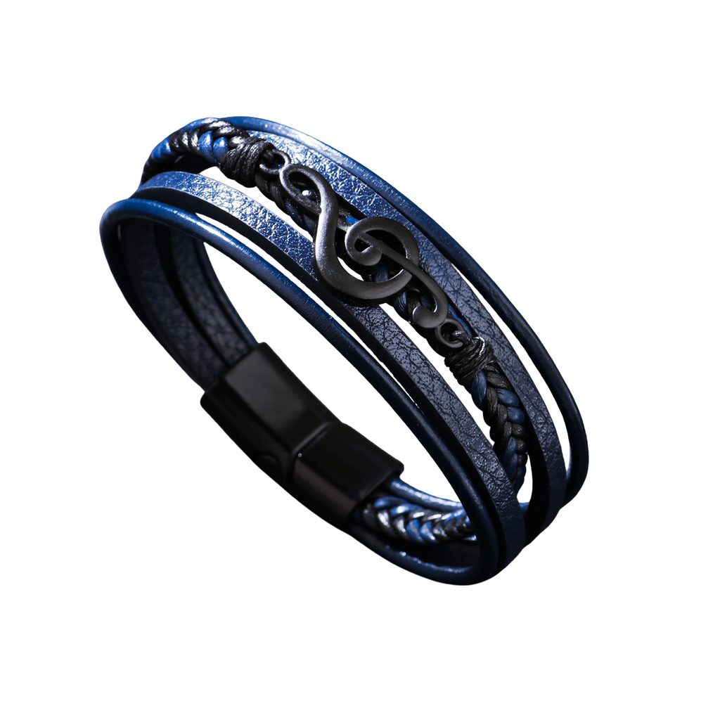 Stílusos, kék színű férfi bőrkarkötő eredeti, többrétegű kialakításával és hegedűkulcs alakú domináns részletével nyűgöz le. A sima és a fonott pántok kombinációja modern, mégis elegáns megjelenést eredményez, amely a mindennapi és alkalmi öltözékeket egyaránt kiegészíti. A karkötőt fekete fémkapocs zárja le, amely erőt és határozott férfias jelleget kölcsönöz neki. Ez a zenei motívummal ellátott férfi karkötő tökéletes választás azoknak a férfiaknak, akik szeretik a zenét, és eredeti részletet szeretnének hozzáadni stílusukhoz.