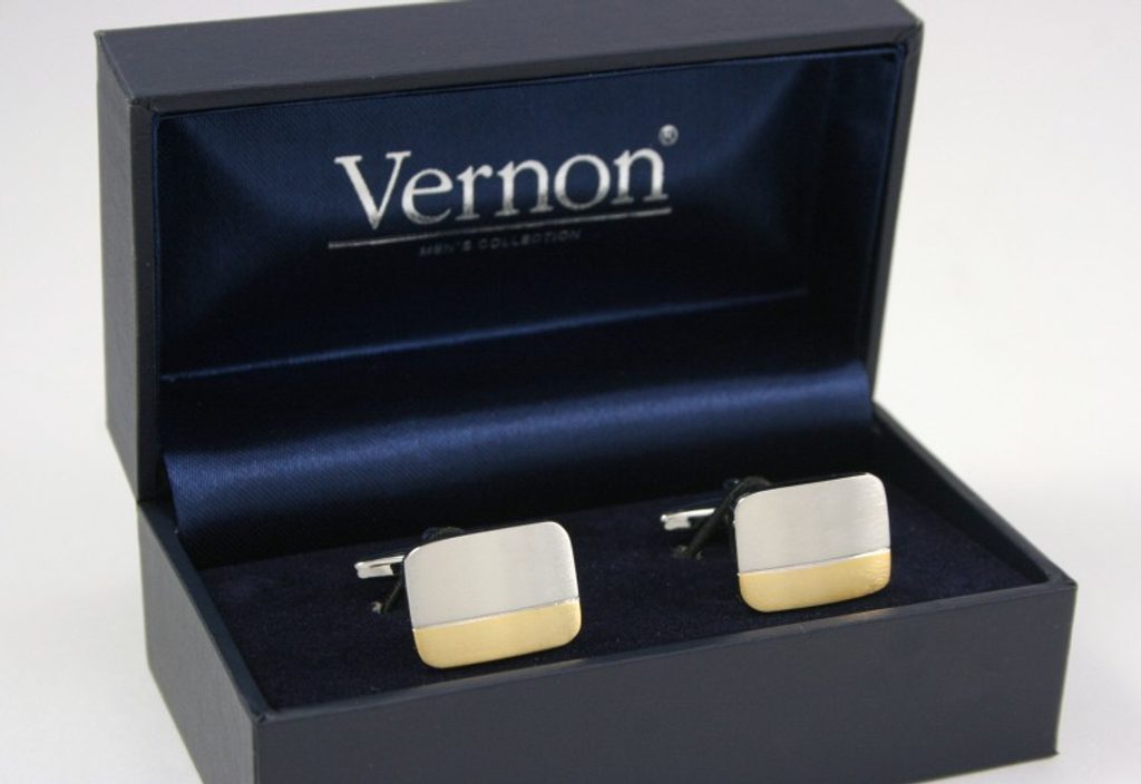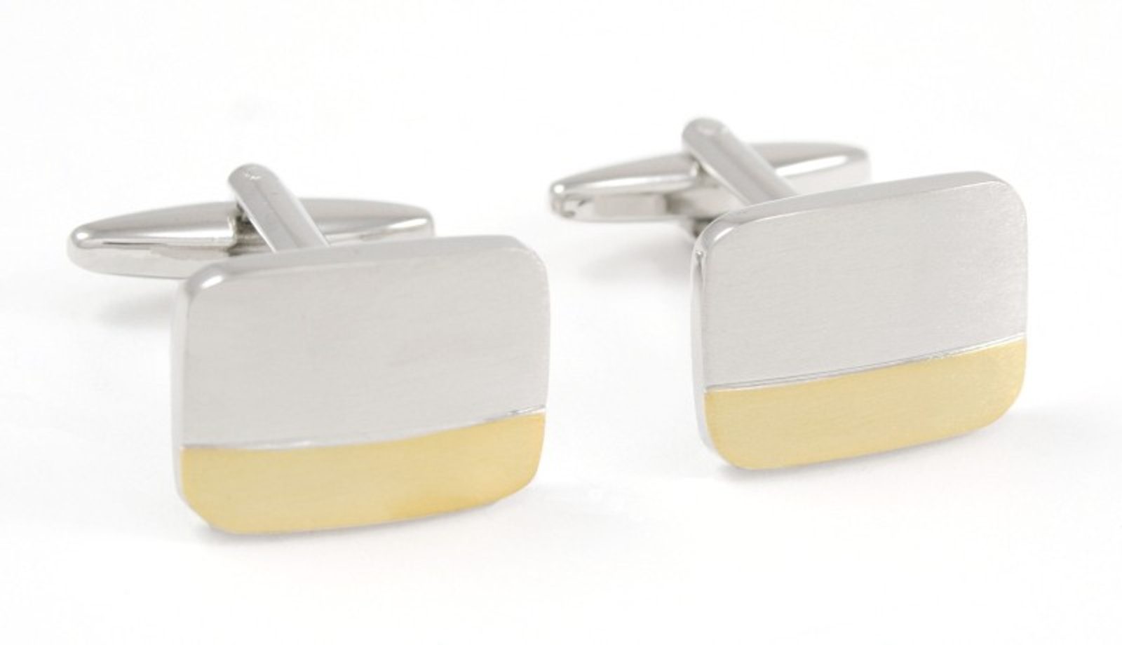 Ezüst színű fényes hatású mandzsettagomb, arany betéttel. Ezüst színben. Szögletes fazon, csatos záródással. Elegáns ékszertartó dobozban. Terméktípus: mandzsettagomb.