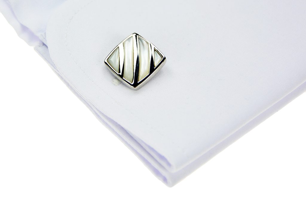 Ezüst színű fényes hatású mandzsettagomb. Ezüst színben. Szögletes fazon, csatos záródással. Elegáns ékszertartó dobozban. Terméktípus: mandzsettagomb.