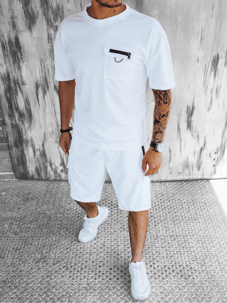 szenzációs férfi szett puha és kellemes tapintású anyagból készült a póló kerek nyakkivágással és mellzsebtel rendelkezik a rövidnadrág dereka szegéllyel rendelkezik húzózsinórral állítható derekúak két első zseb és két oldalzseb Anyaga: 65% pamut, 35% poliészter