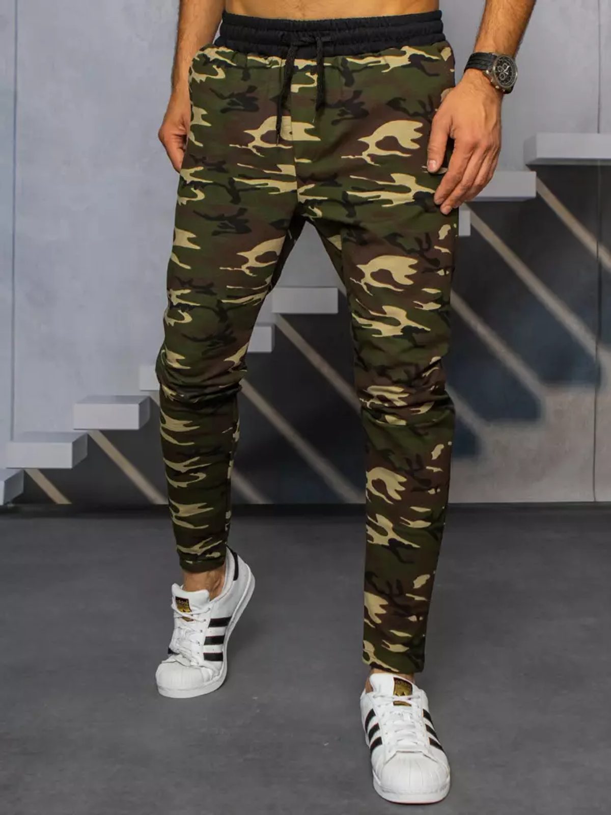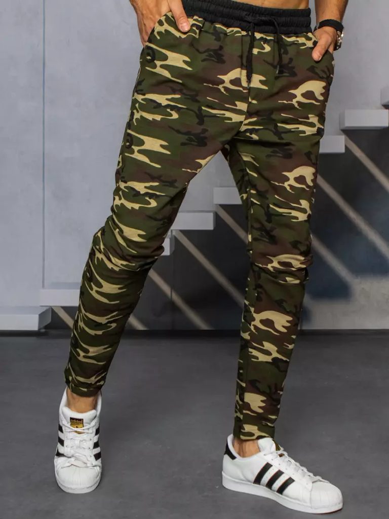 Egy kényelmes és trendi melegítő alsó. Teljes felületén terepmintás kivitelben. Barna színben. Kiváló minőségű, puha, kényelmes viseletet biztosító szövetből készült. Normál derékmagasságú, lezser fazon, bő, alul gumírozott nadrágszárakkal. Derékban gumírozott integrált öv és megkötő. Kétoldalt benyulós zsebek.