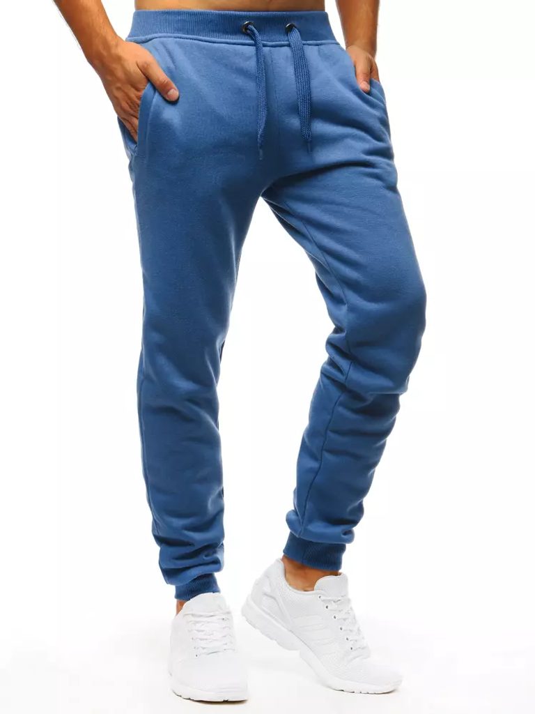 Kényelmes anyagból készült, kék melegítő alsó. Normál derékmagasságú, lezsér fazon, gumírozott nadrágszárakkal. Derékban gumírozott integrált öv és megkötő. Kétoldalt benyulós zsebek.