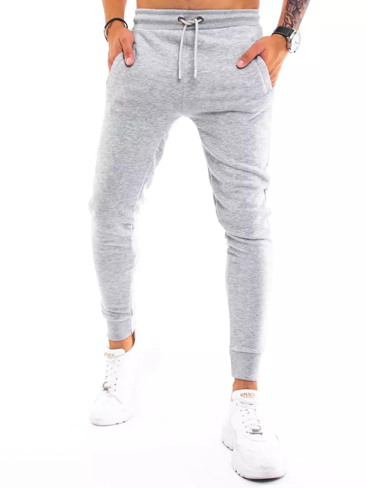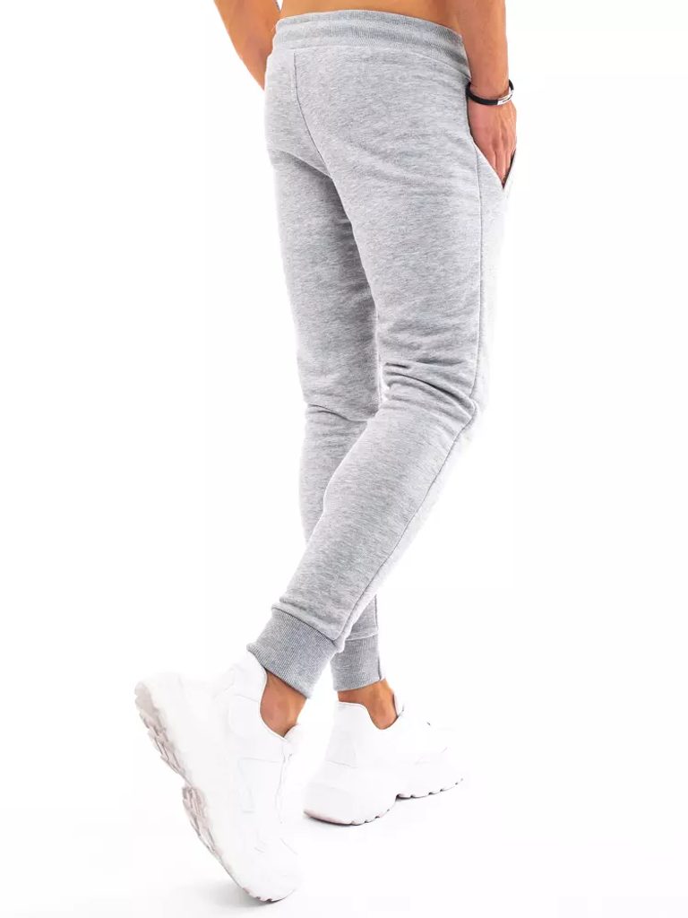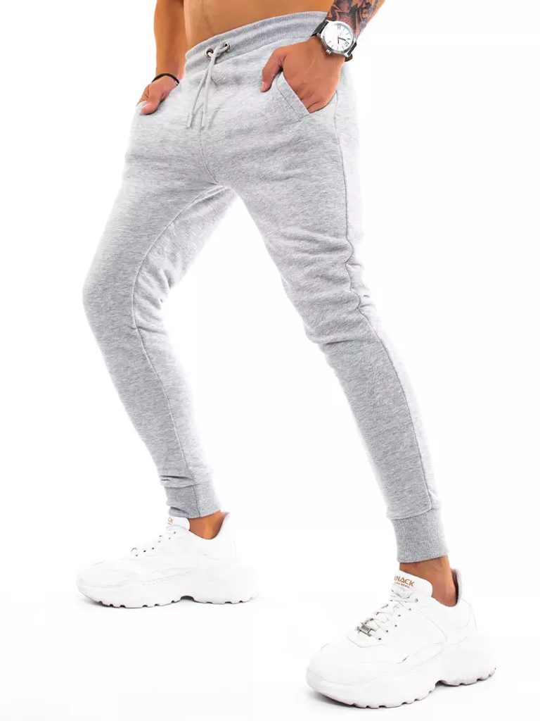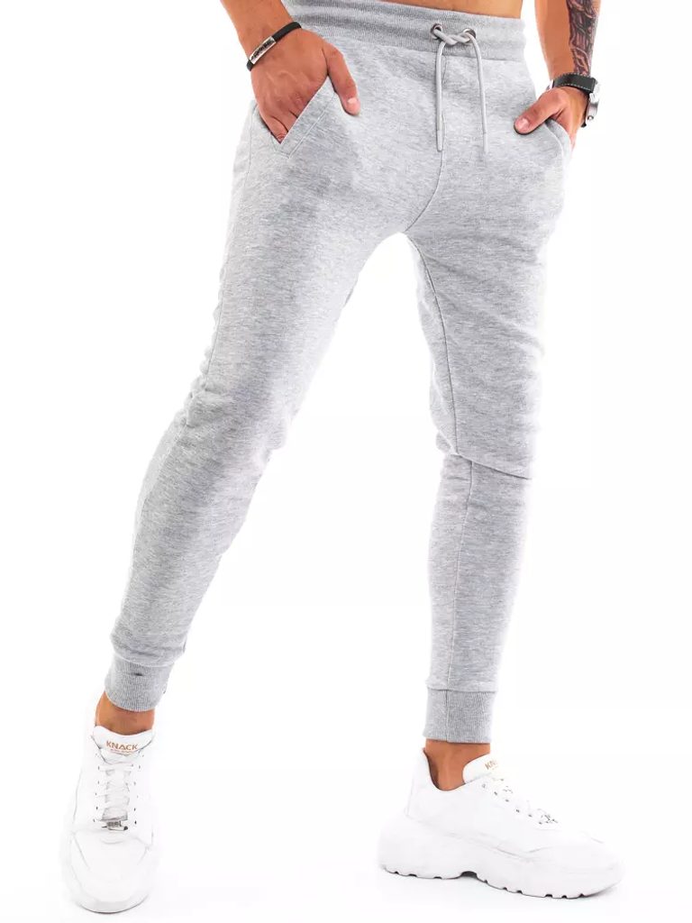 Szürke hagyományos melegítő alsó. Két lábszárán benyulós oldalsó zsebbel. Rugalmas derékrészén zsinórbehúzással. Lefelé szűkülő szárral, bordázott szegély a nadrágszáron. Kellemes viseletet biztosító anyagból.