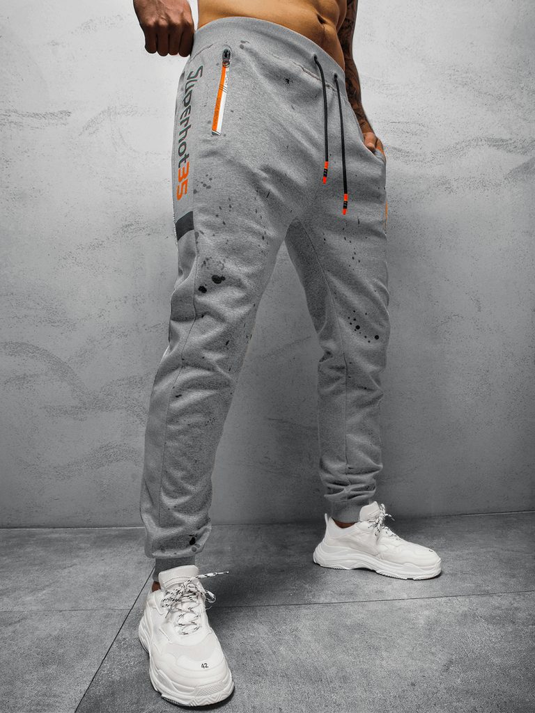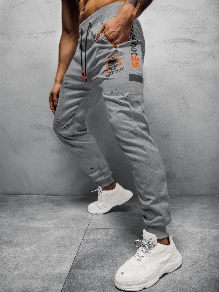 Egyszerű sportos melegítő alsó. Szürke foltozott kivitelben. Kiváló minőségű, puha, kényelmes viseletet biztosító szövetből készült. Normál derékmagasságú, lezser fazon, gumírozott nadrágszárakkal. Derékban gumírozott öv és megkötő. Kétoldaltcipzáras zsebek. Comb részén nyomtatott felirattal.