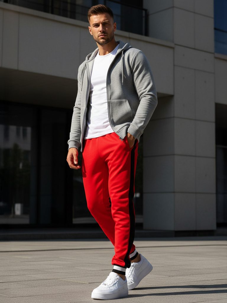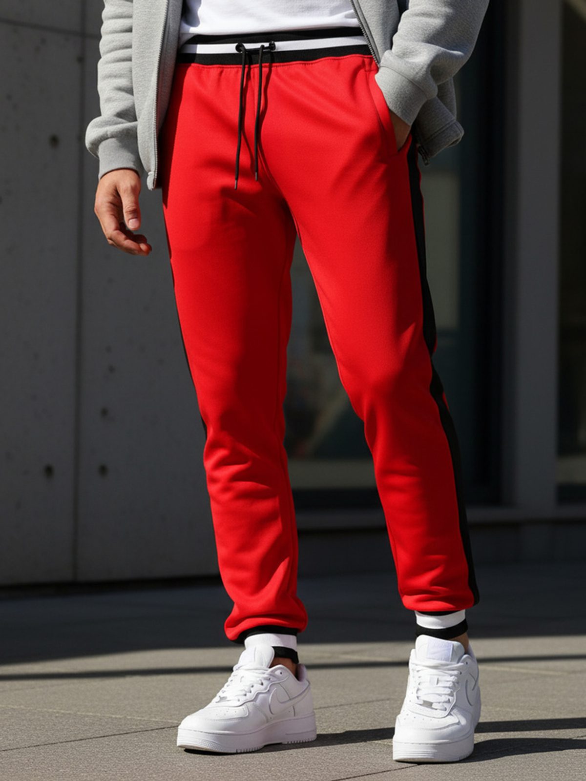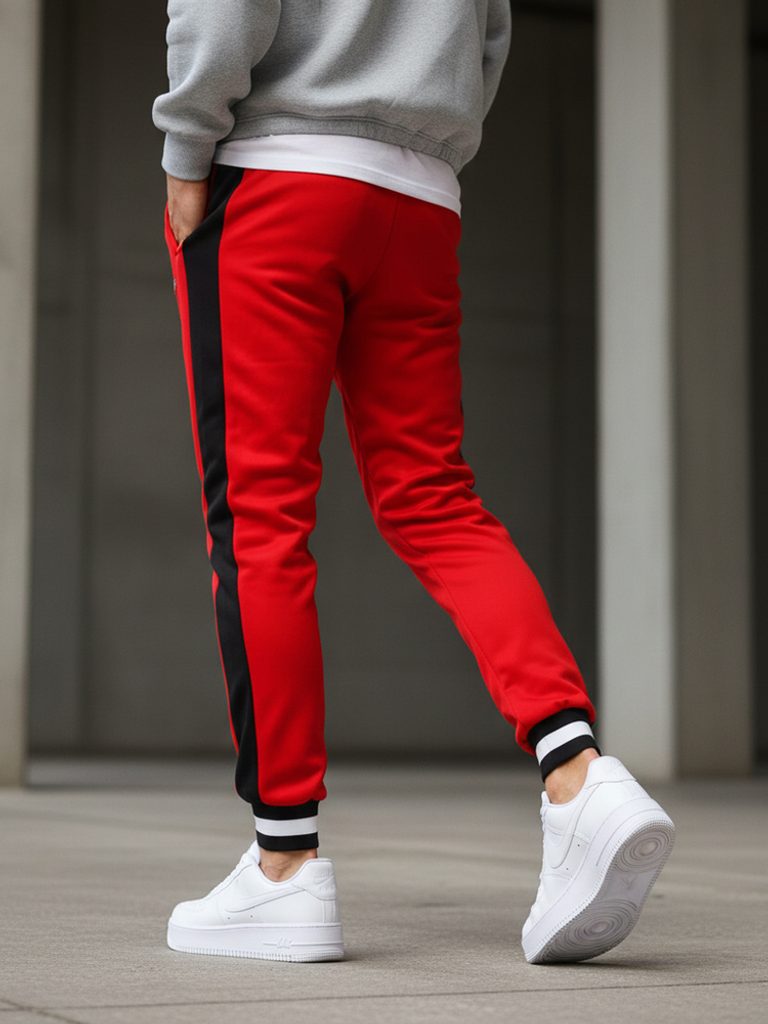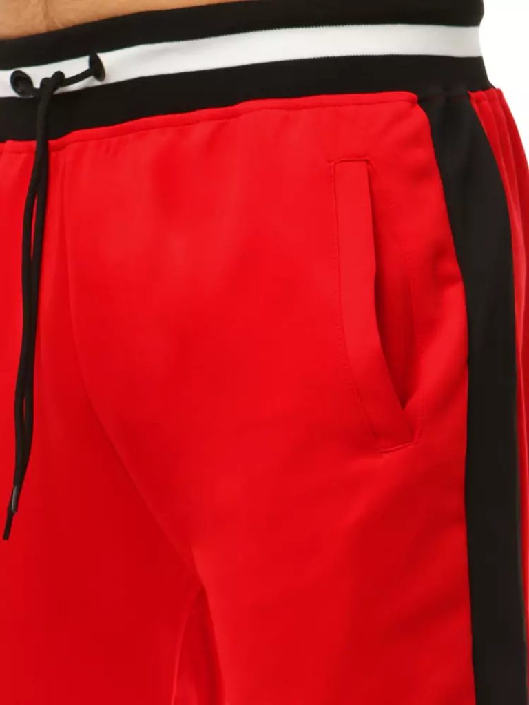Piros melegítő nadrág. Puha, kényelmes anyagból készült. Színes csíkkal. Két benyulós oldalsó zsebbel. Két far zsebbel. Normál derékmagasságú, lezsér fazon, gumírozott nadrágszárakkal. Derékban gumírozott integrált öv és megkötő. Kétoldalt benyulós zsebek. Sportoláshoz garantáltan kényelmes. A hétköznapokon szuperül megállja majd a helyét.
