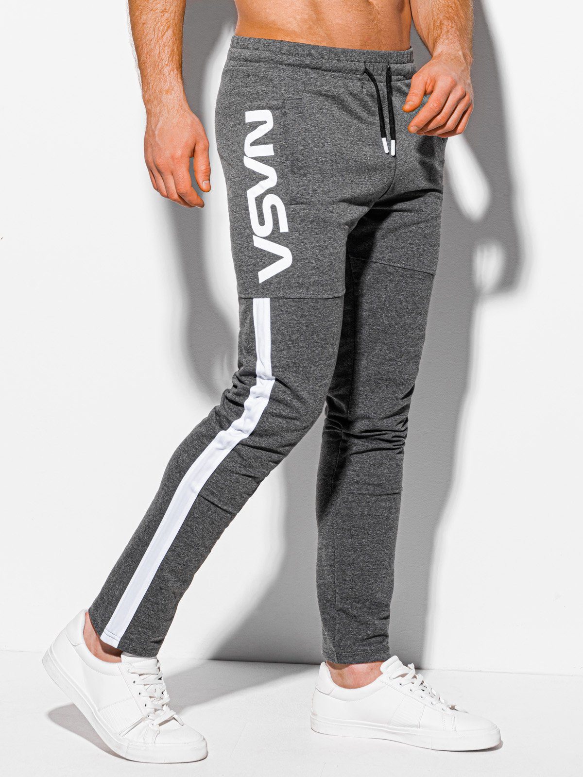 Sötté szürke színben. Enyhén rugalmas, kényelmes viseletet biztosító anyagból készült. Univerzális, bokáig érő fazon, testhezálló szárakkal. Gumírozott derékrésszel, zsinórdebúhással. Kétoldalt benyúlós zsebek. Fehér oldalsó csíkkal. NASA felirattal.