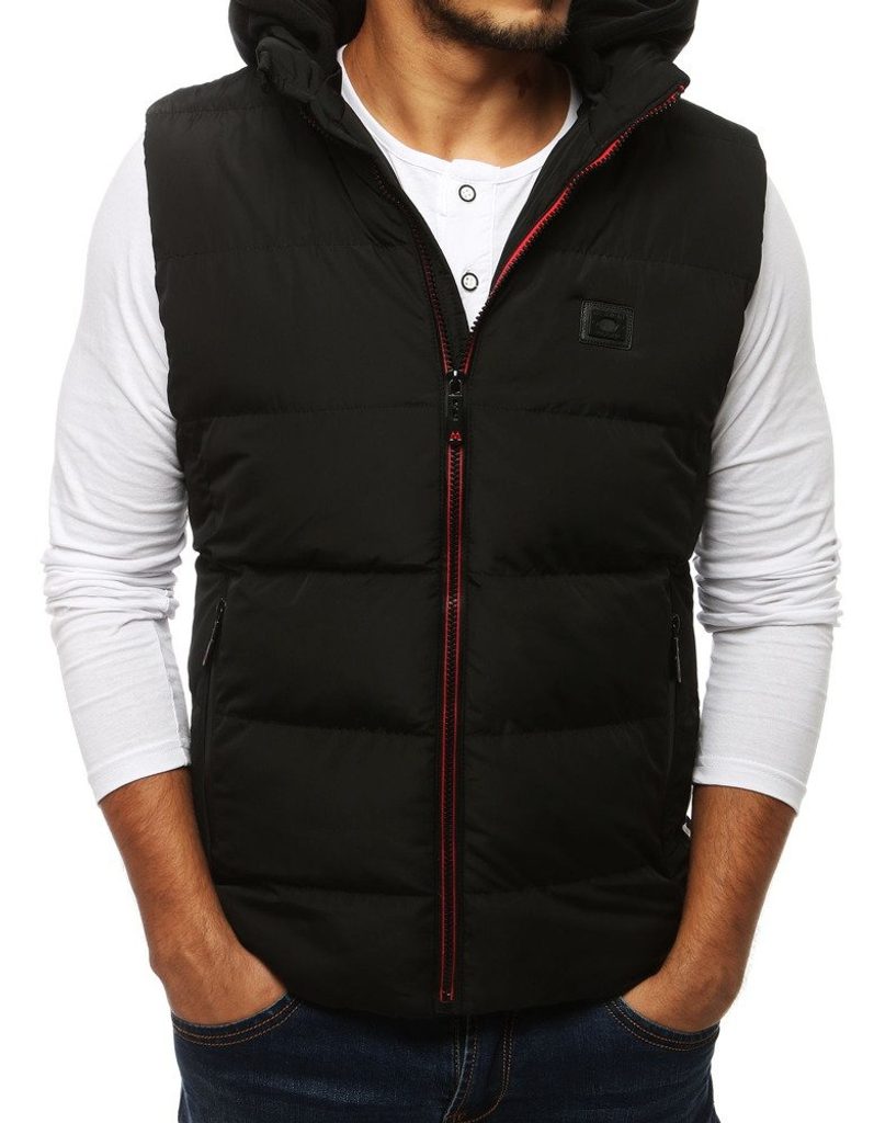 Fekete steppelt mellény sima felülettel, melegítőszövetből készült. Egyszerű kapucnis modell. Fekete pamut kapucnival. Cipzáros rögzítéssel. Cipzáros oldalzsebekkel. Oldalt fehér csíkkal.
