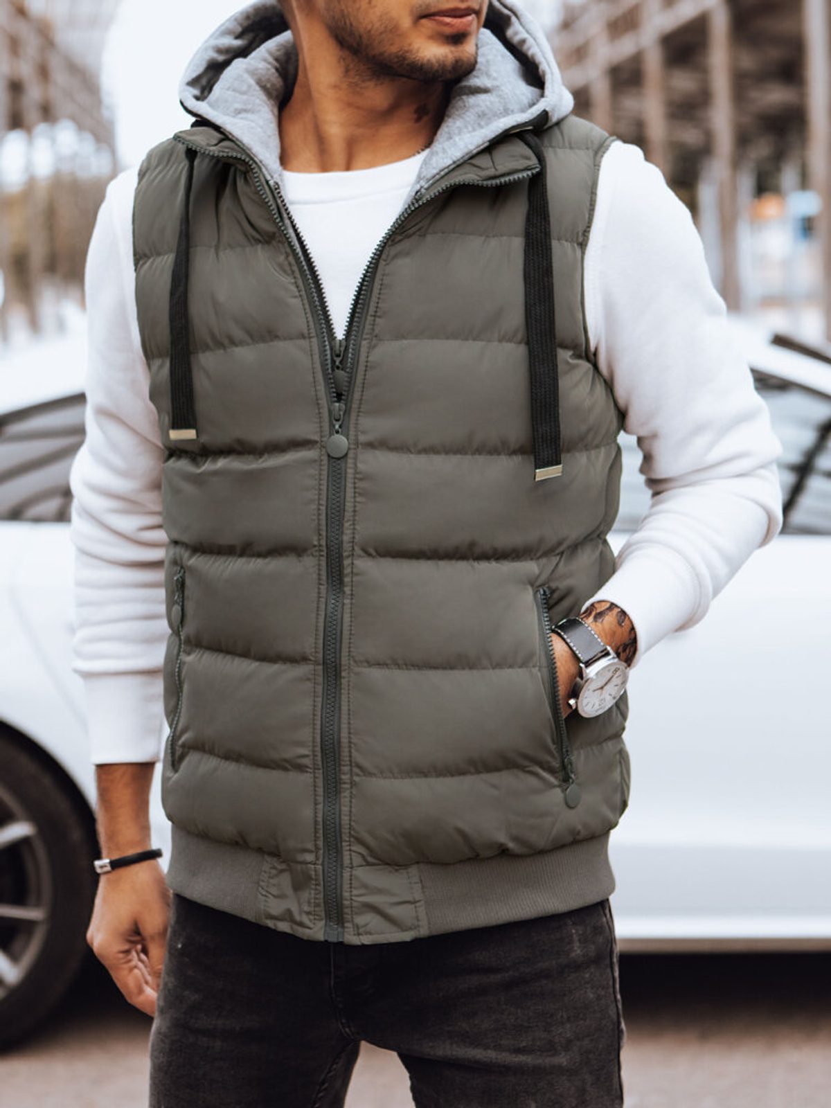 steppelt mellény cipzáros záródás levehető kapucni, húzózsinórral állítható két külső cipzáras zseb egy belső zseb anyaga: 100% poliészter