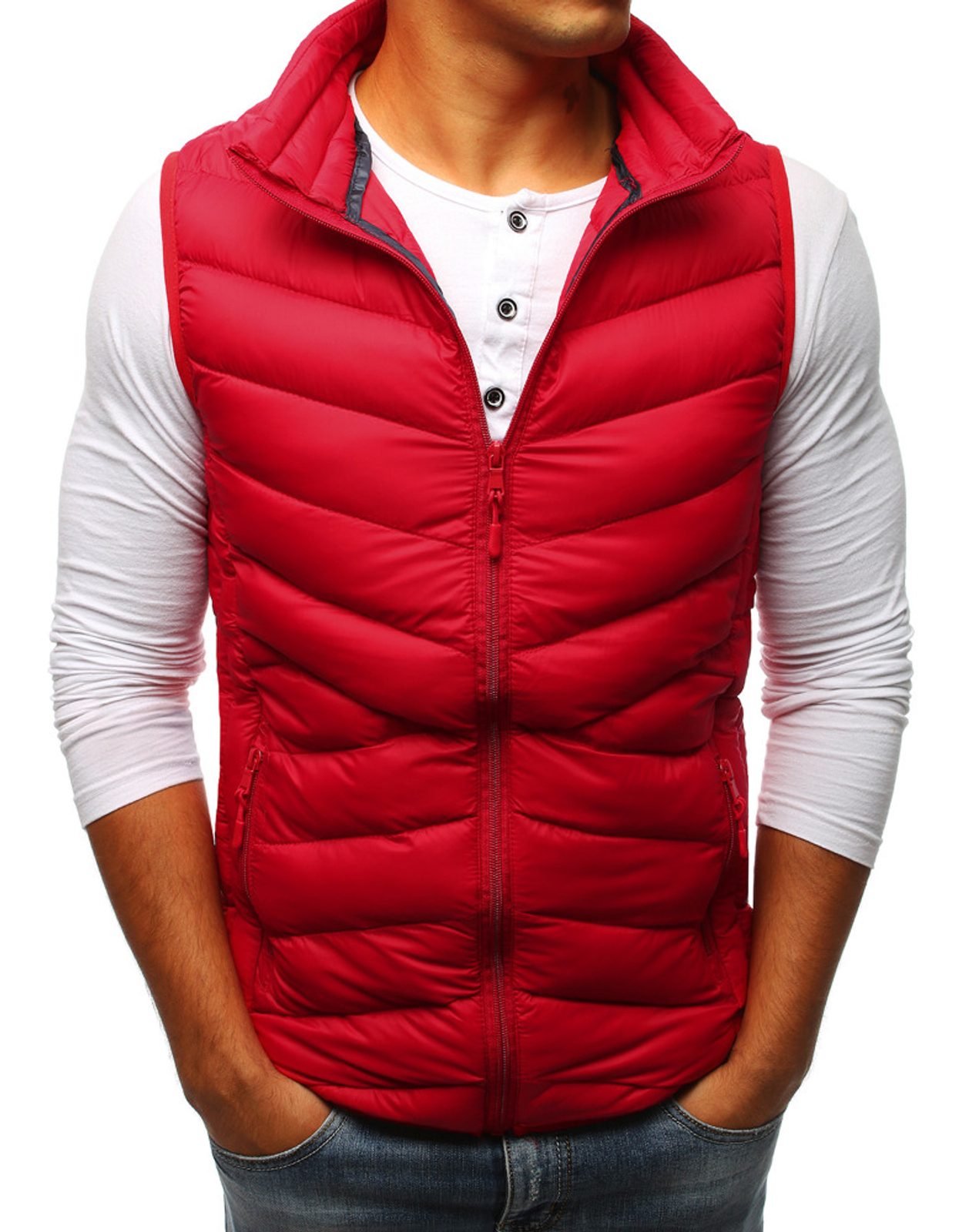 Piros steppelt mellény sima felülettel, melegítőszövetből készült. Egyszerű kapucni nélküli modell. Cipzáros rögzítéssel. Állógallérral. Cipzáros oldalzsebekkel.