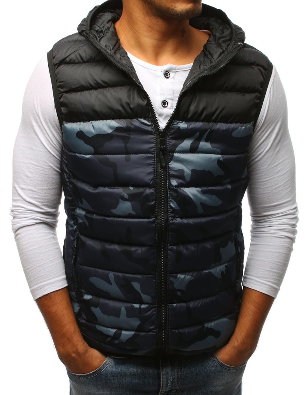 Sötét kék terepmintás steppelt mellény sima felülettel, melegítőszövetből készült. Kapucnis fazon. Állógallérral, elöl cipzárral, rejtett cipzáros oldalzsebekkel.