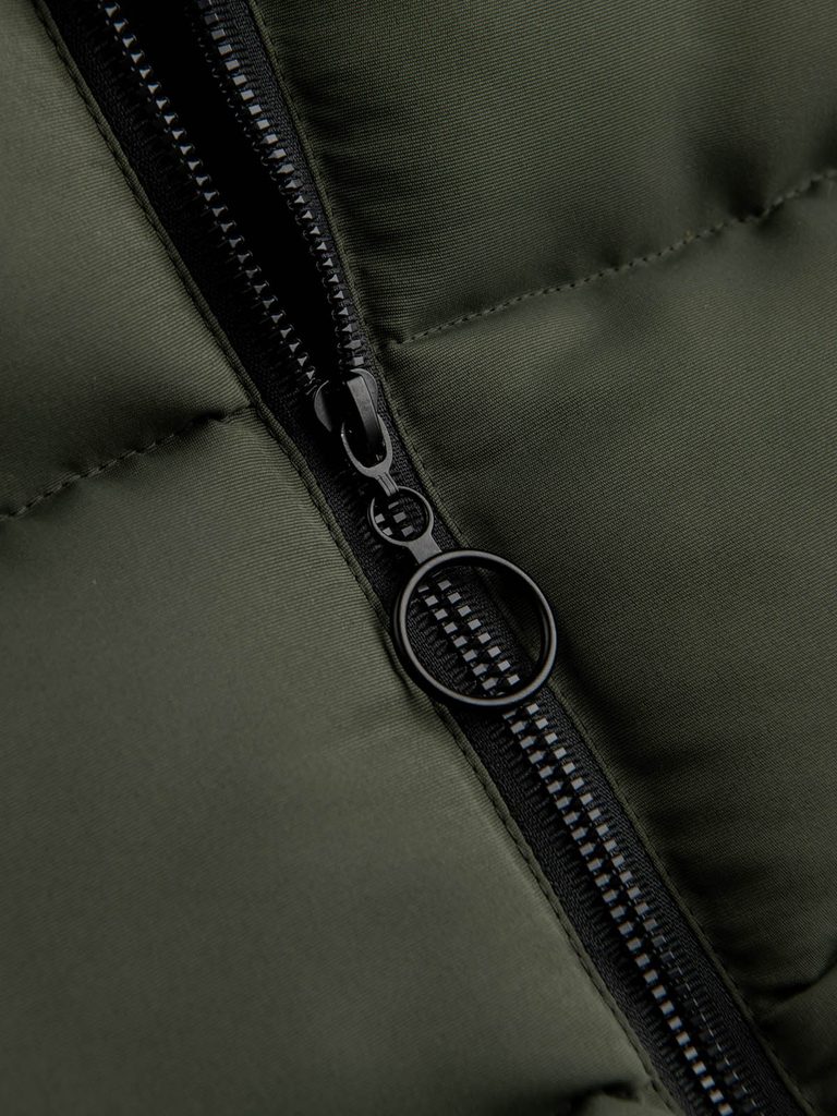 Érdekes kombinált steppelt mellény sima felülettel, melegítőszövetből készült. Jól variálható alap darab a hűvösebb átmeneti időszakra. Egyszerű kapucni nélküli modell. Cipzáros rögzítéssel. Benuylós oldalzsebekkel.