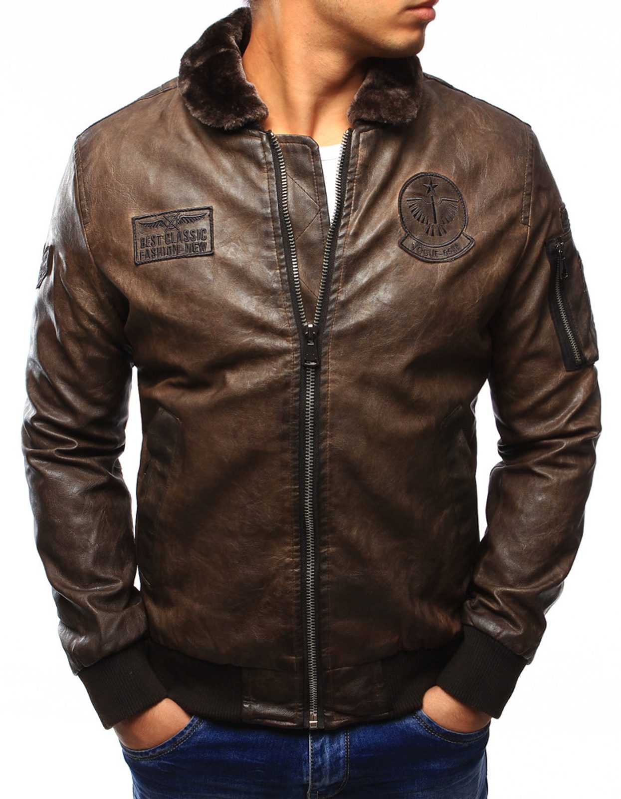 Divatos stílusú férfi barna színű dzseki. Az igazi bőrt remekül imitáló, kitartó öko bőrből készült. Alakra szabott, klasszikus fazon, kis kihajtott szörmével díszített gallérral és hosszú ujjakkal. Kétoldalt benyúló zsebek, elöl cipzáras rögzítéssel. Gumírozott szövettel befejezett ujjakkal és derékrésszel.