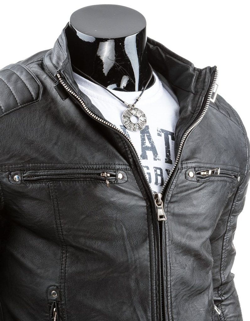 Fekete stílusos műbőrzseki. Kapcsos rövid álló gallérral. Vállán és ujjain dísztűzéssel. Cipzáras mellzsebekkel, cipzáras oldalzsebbel. Belső kidolgozása zsebekkel és béléssel.
