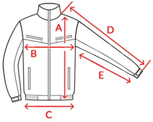 | Méret | Hossz A | Bőség B | Alsó bőség C | Külső ujjhossz D | Belső ujjhossz E |