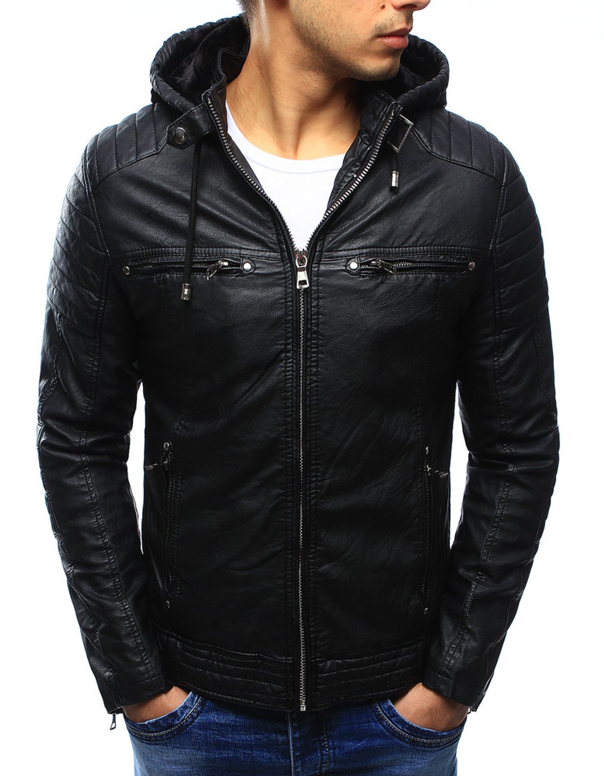 Rövid fekete feltűnő öko bőrdzseki. Kiváló minőségű, öko bőrből készült, alatta puha bélés található. Testhezálló fazon, rövid álló gallérral. Lekapcsolható pamut kapucni. Elöl fémes cipzár, kétoldalt cipzáras zsebek, bvalamint két mell zseb. Derékig érő hossz. Tuti összeállításokat tudsz vele alkatni.