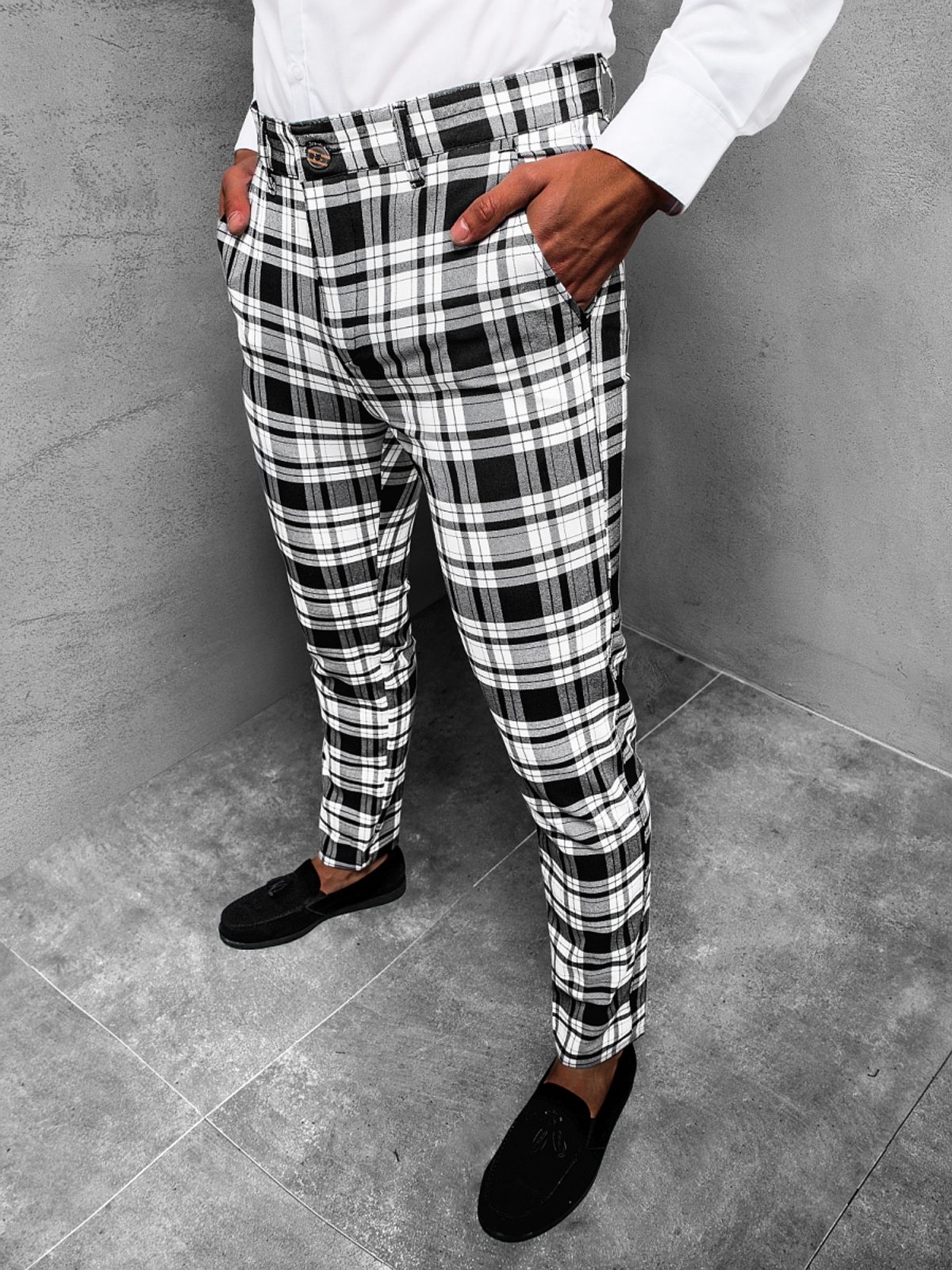Elegáns, divatos férfi nadrág. Időtálló kockás mintával díszített, melyet a fekete szín dobja fel. Enyhén rugalmas, kényelmes viseletet biztosító anyagból készült. Univerzális, bokáig érő fazon, testhezálló szárakkal. Elöl cipzáras és kétkapcsos rögzítés. Kétoldalt benyúlós zsebek, hátul zsebimitációk.