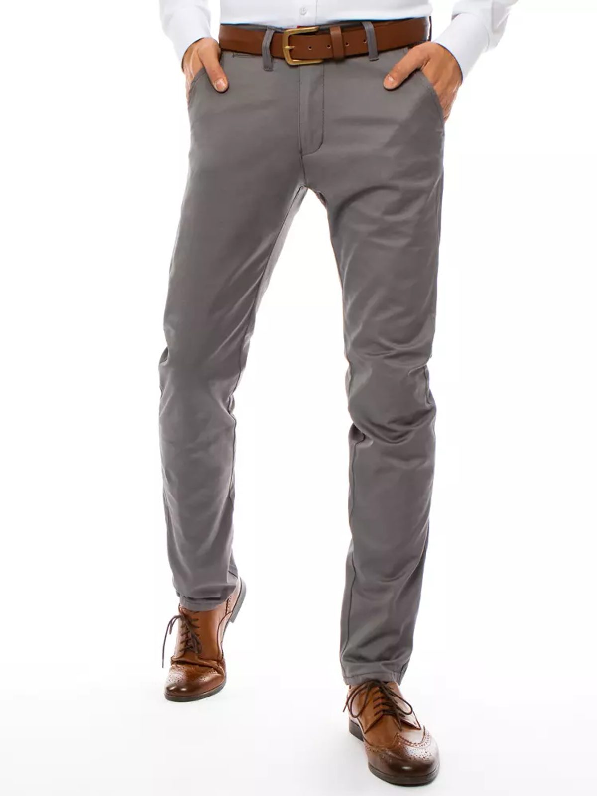 Lezser stílusú chinó nadrág. Halvány szürke színben. Puha, kellemes viseletet biztosító pamut anyagból készült. Enyhén testhezálló fazon, normál derékmagassággal, hosszú, lefelé szűkülő lábszárakkal. Kétoldalt benyúlós zsebek, hátul két farzseb. Derékban övbújtatók. Jól kombinálható.