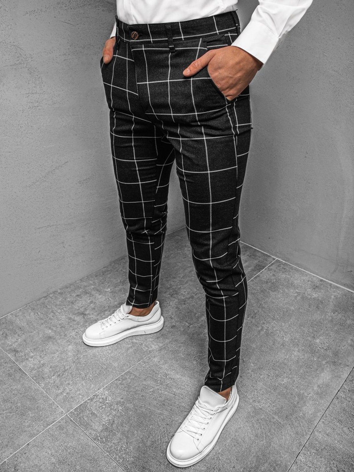 Elegáns, divatos férfi nadrág. Időtálló kockás mintával díszített, melyet a fekete szín dobja fel. Enyhén rugalmas, kényelmes viseletet biztosító anyagból készült. Univerzális, bokáig érő fazon, testhezálló szárakkal. Elöl cipzáras és kétkapcsos rögzítés. Kétoldalt benyúlós zsebek, hátul zsebimitációk.