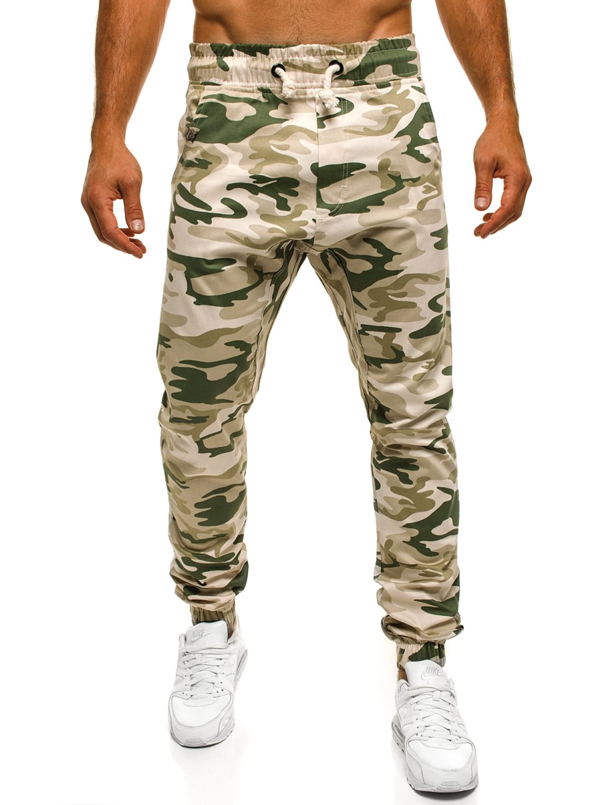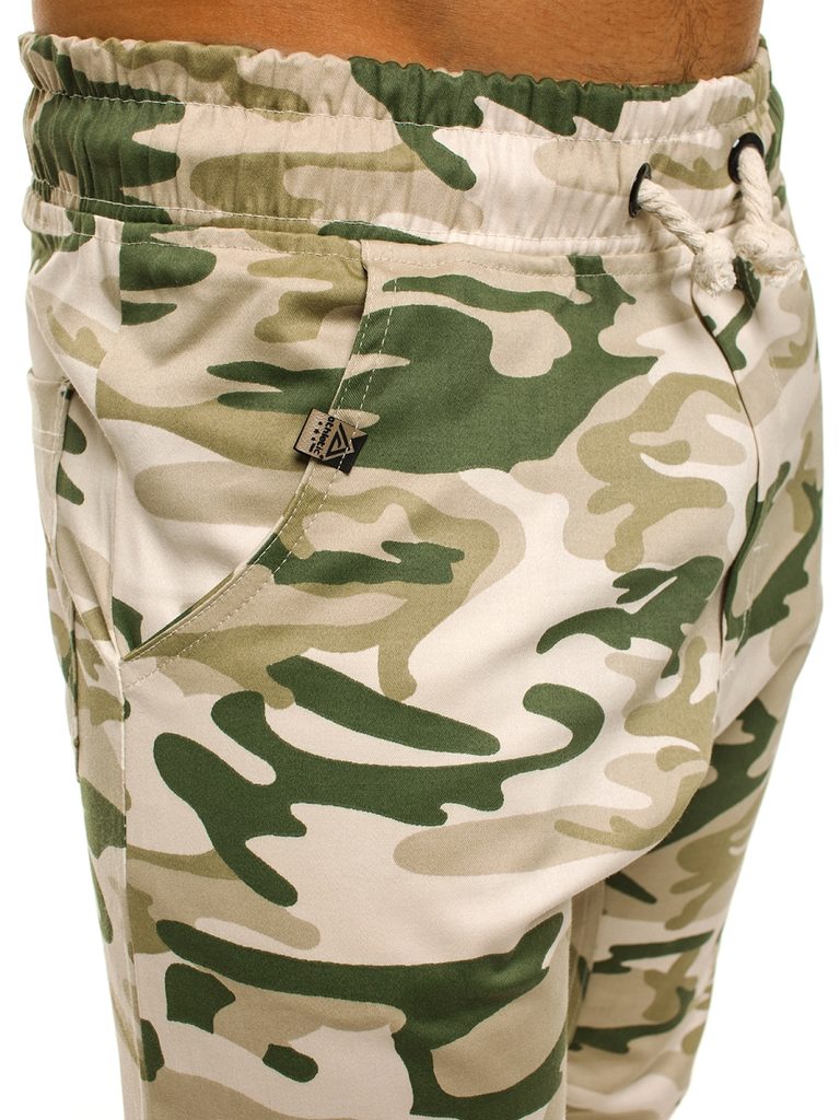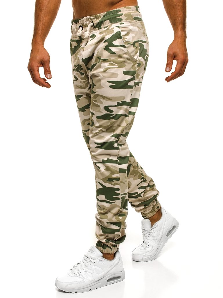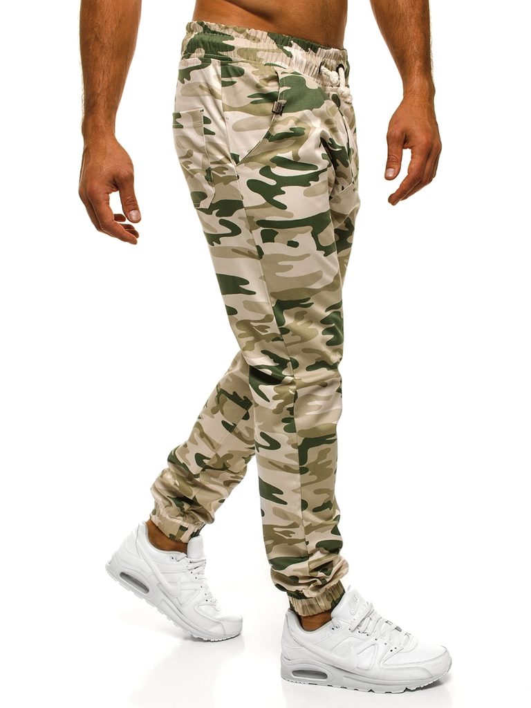 Minőségi terepmintás jogger melegítő nadrág. Stílusos halvány terepszínű kivitelben. Hétköznapi viseletre, de sportolásra egyaránt megfelelő viselet. A derékpánt gumis, zsinórbehúzással ellátva. A lábszár allja is gumis. Két oldalsó zsebbel, valamint farzsebekkel ellátva.