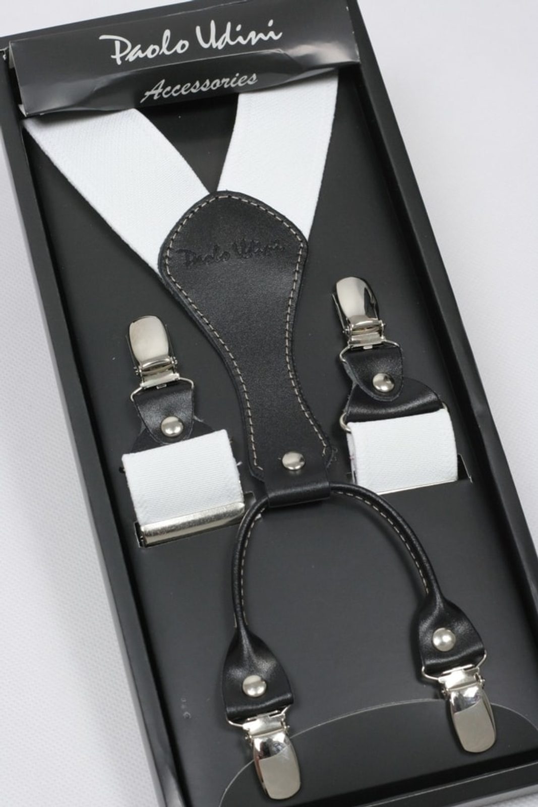 Férfi fehér nadrágtartó klasszikus kivitelben. A pántok hossza állítható, ami tökéletes illeszkedést tesz lehetővé. A nadrágtartó, mint férfidivat-kiegészítő az elmúlt szezon slágere.