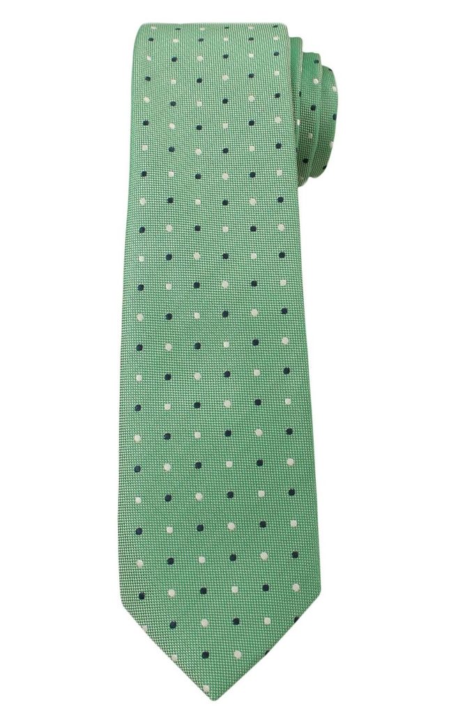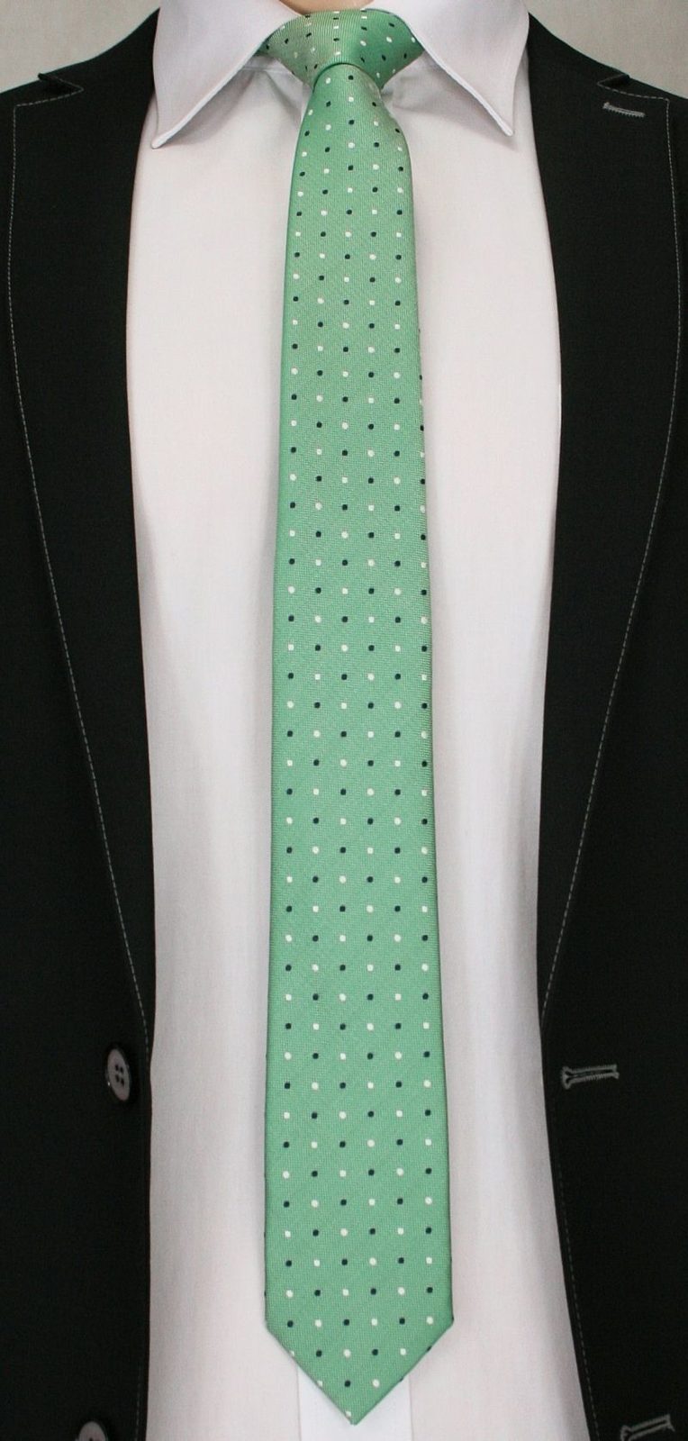 Halvány zöld pöttyös nyakkendő férfiaknak, amely első látásra leköti a figyelmét modern átvitelével. A nyakkendő szabása klasszikus. Ez a férfi nyakkendő modell feleleveníti az összes elegáns ruházatot.