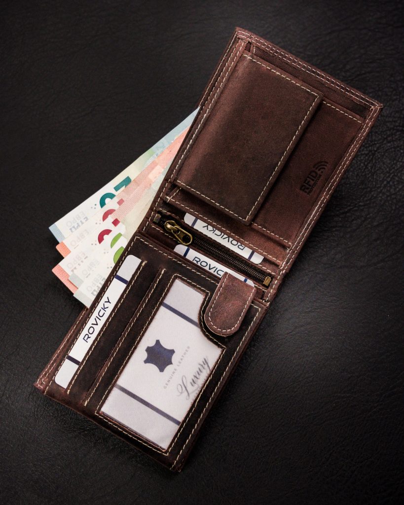 Elegáns kialakítású, minőségi bőrből készült pénztárca. A pénztárca modellje a szélességhez igazodik. Ez a modell csat nélkül készült. A belső térben több rekesz található, amit mindenki értékelni fog, aki szereti együtt tartani a hitelkártyáit, kártyáit és egyéb dolgait. Az RFID-védelem magától értetődő.