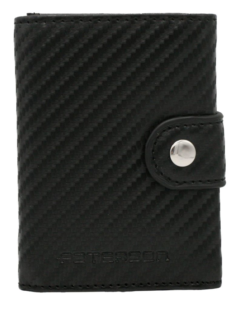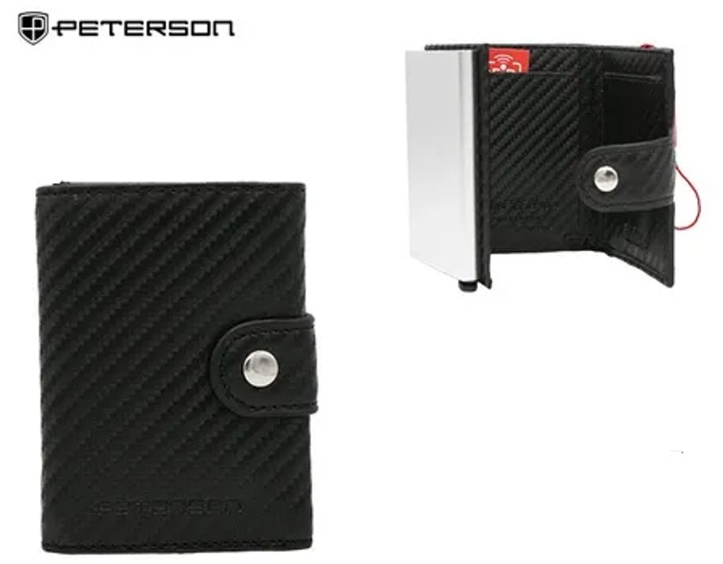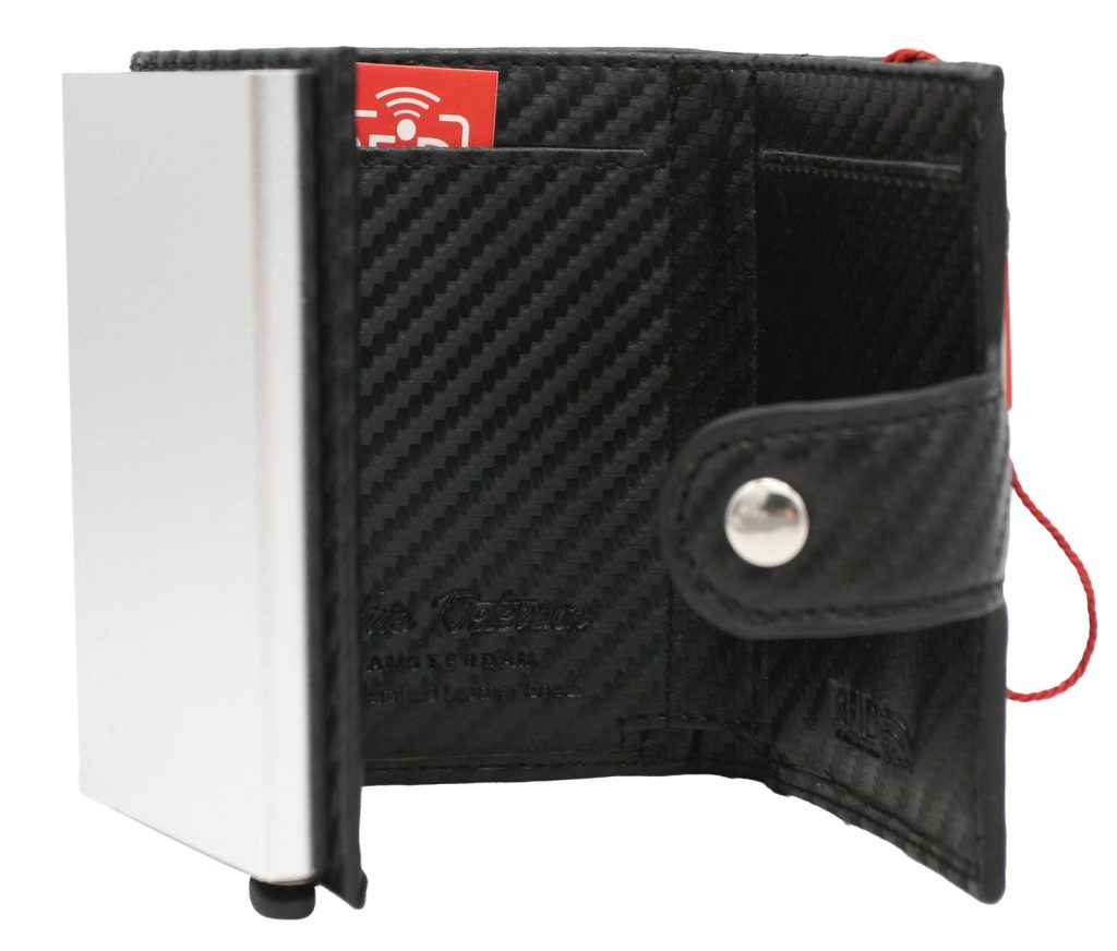 A divatos, csatos pénztárca kiváló minőségű, kombinált anyagból készült - karbon textúrájú természetes bőr + alumínium.