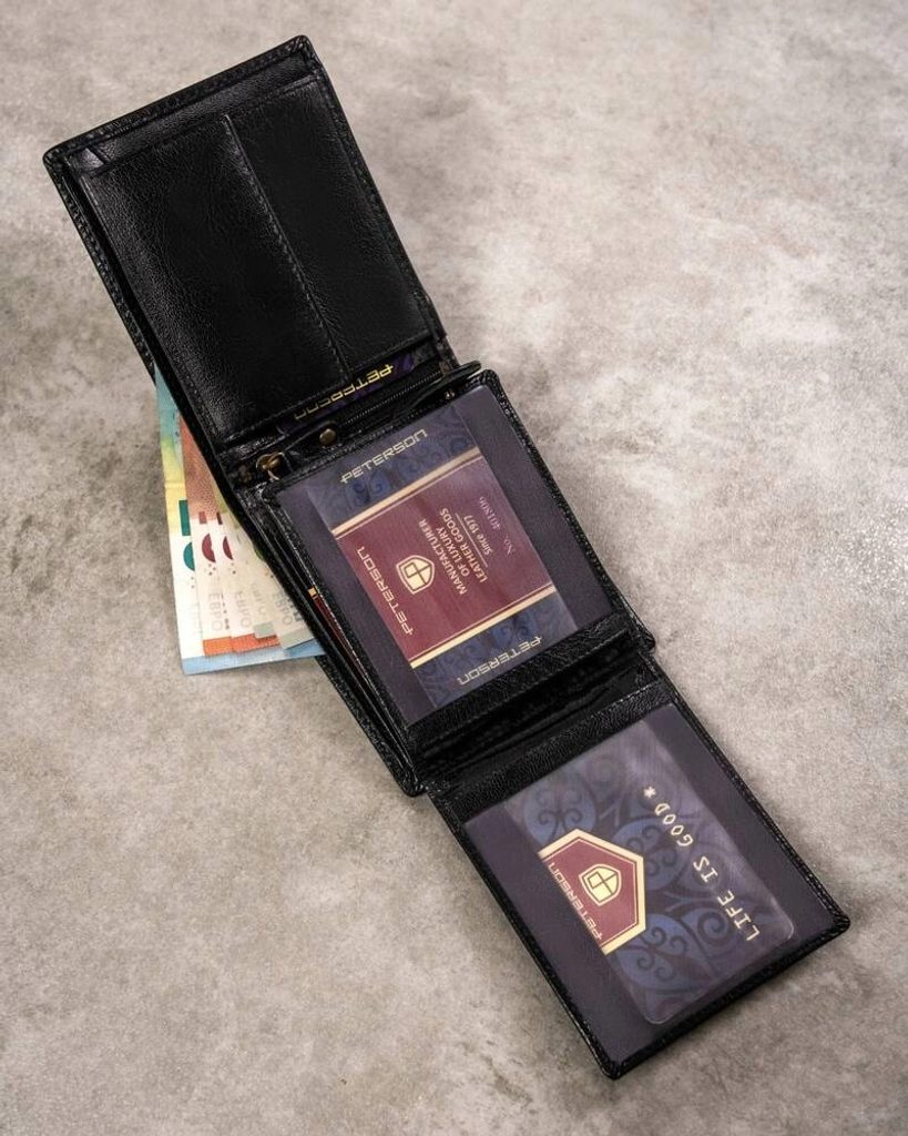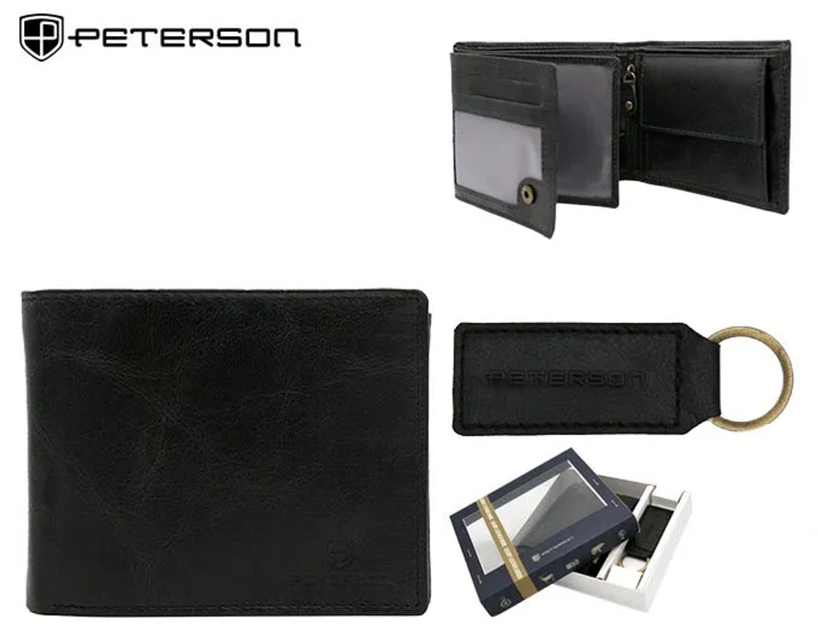 Az elegáns férfi pénztárca és a praktikus kulcstartó kiváló minőségű bőrből készült. A divatos kialakítású pénztárca bőséges tárolóhellyel és RFID-rendszerrel rendelkezik. A pénztárca bankjegyek (2 rekesz), névjegykártyák, hitelkártyák (8 rekesz) és egy érmezseb számára kialakított rekeszeket tartalmaz.
