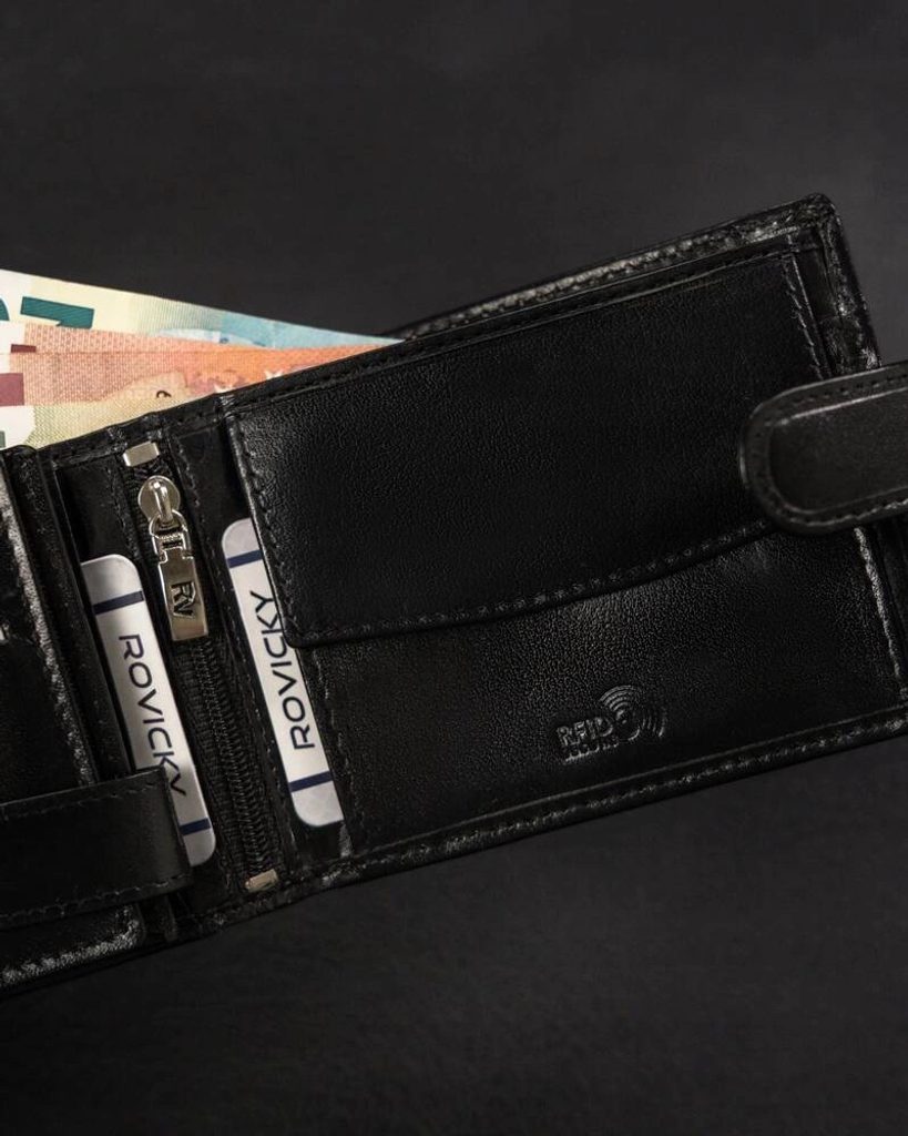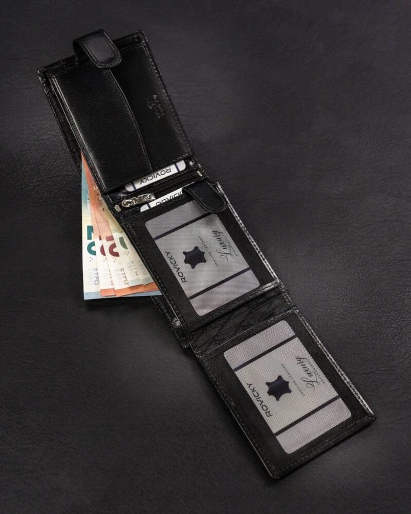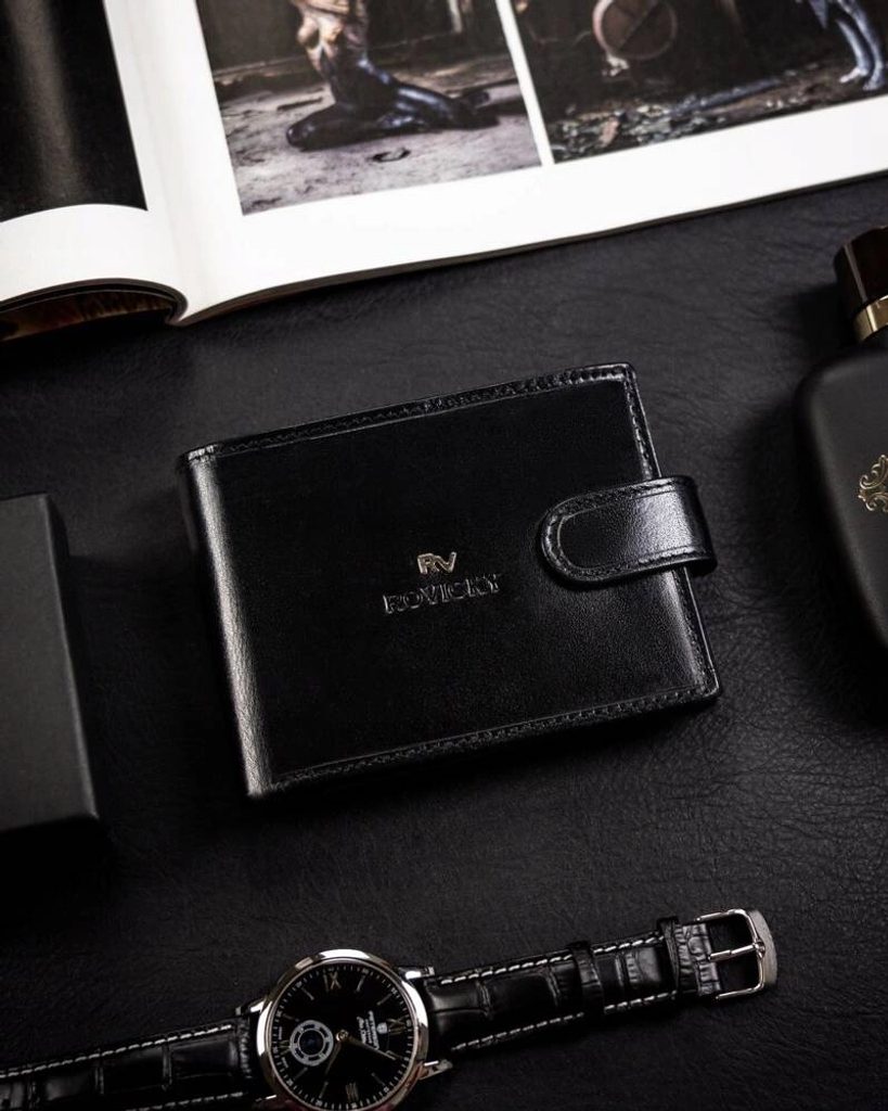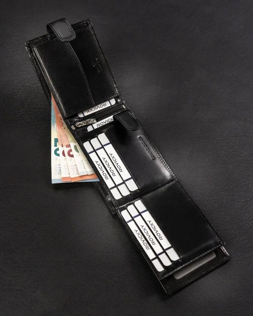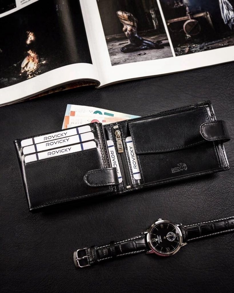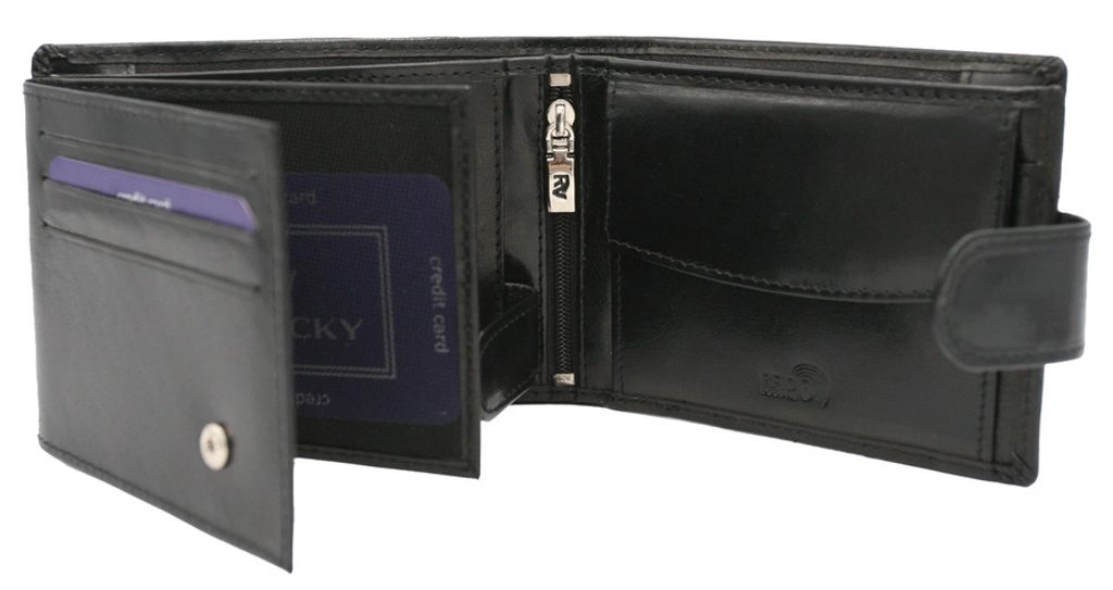 Elegáns kialakítású, minőségi bőrből készült pénztárca. A pénztárca modellje a szélességhez igazodik. Ez a modell praktikus csattal van ellátva. A belső térben több rekesz található, amit mindenki értékelni fog, aki szereti együtt tartani a hitelkártyáit, kártyáit és egyéb dolgait. Az RFID-védelem magától értetődő.