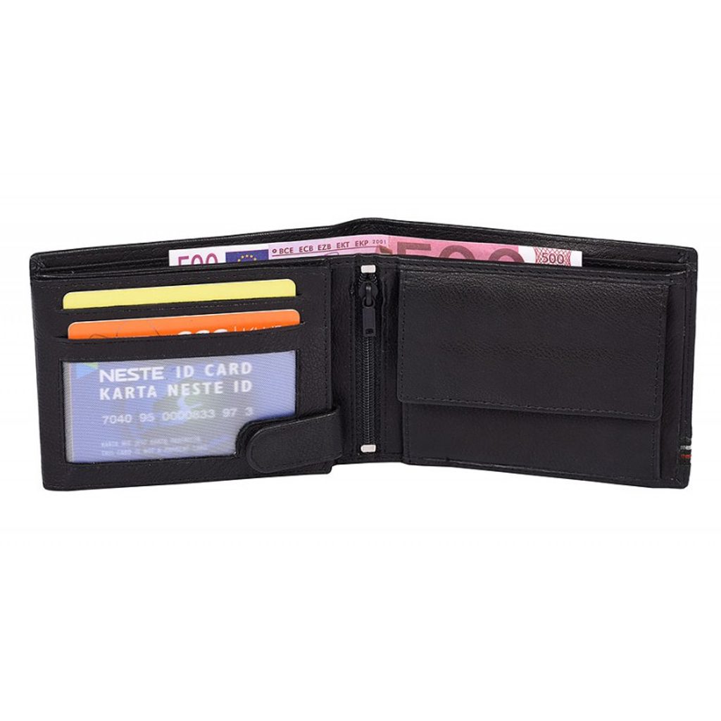 Trendi fekete pénztárca. Külső felüleletén a gyártó logója valamint színes csíkkal díszített. Kártyatartó rekesszel, átlátszó felületű rekesszel, az apró pénz rekesz patttengombos záródással. Több papír pénzrekesszel. Díszdobozba csomagolva kerül kiszállításra. Minden praktikus férfi számára.