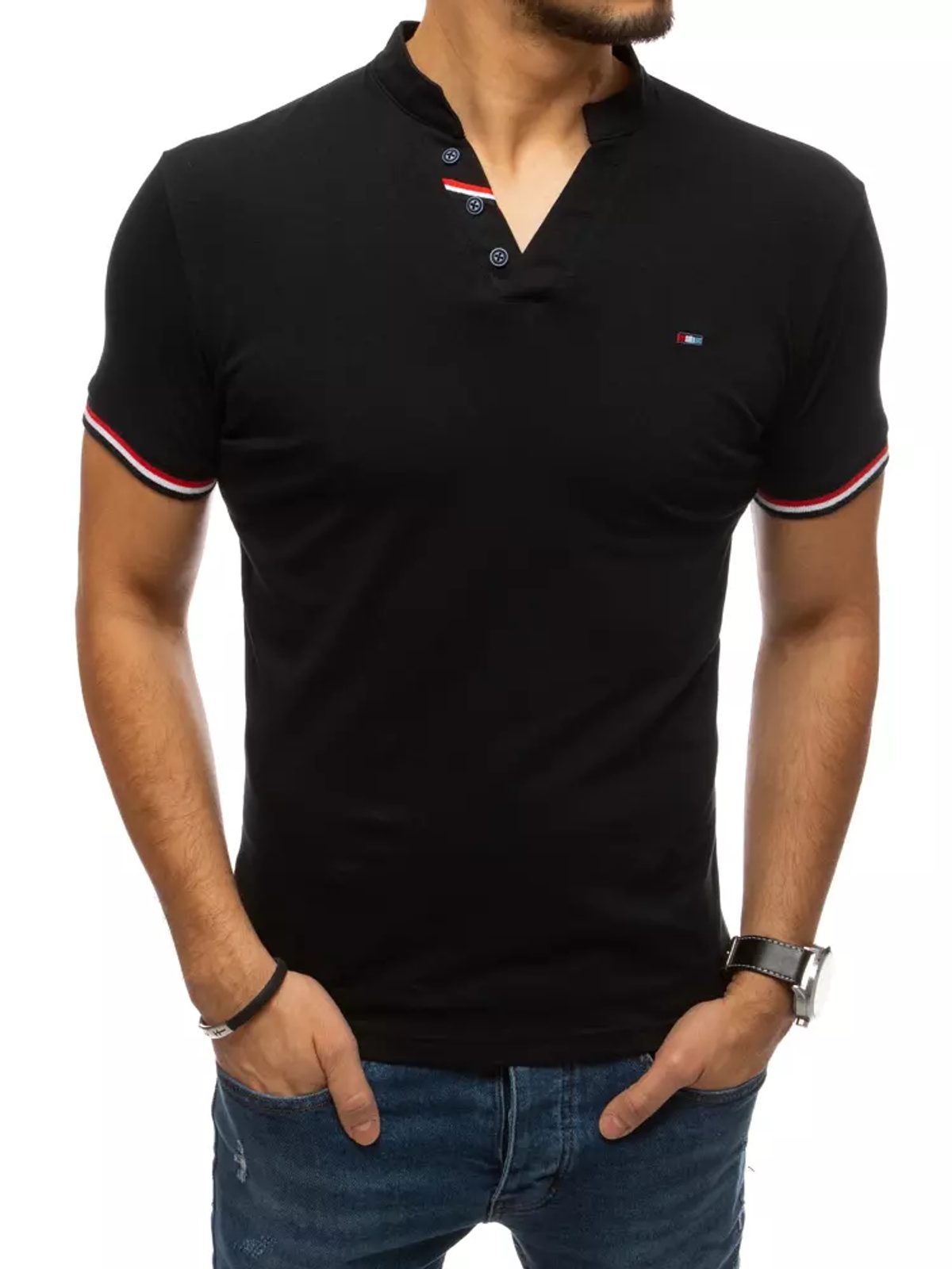 Látványos fekete színű galléros póló. Kényelmes pamut anyag. Klasszikus kihajtott gallér, rövid gombolás pánt. Színes szegély a gallér mentén, valamint az ujjakon.