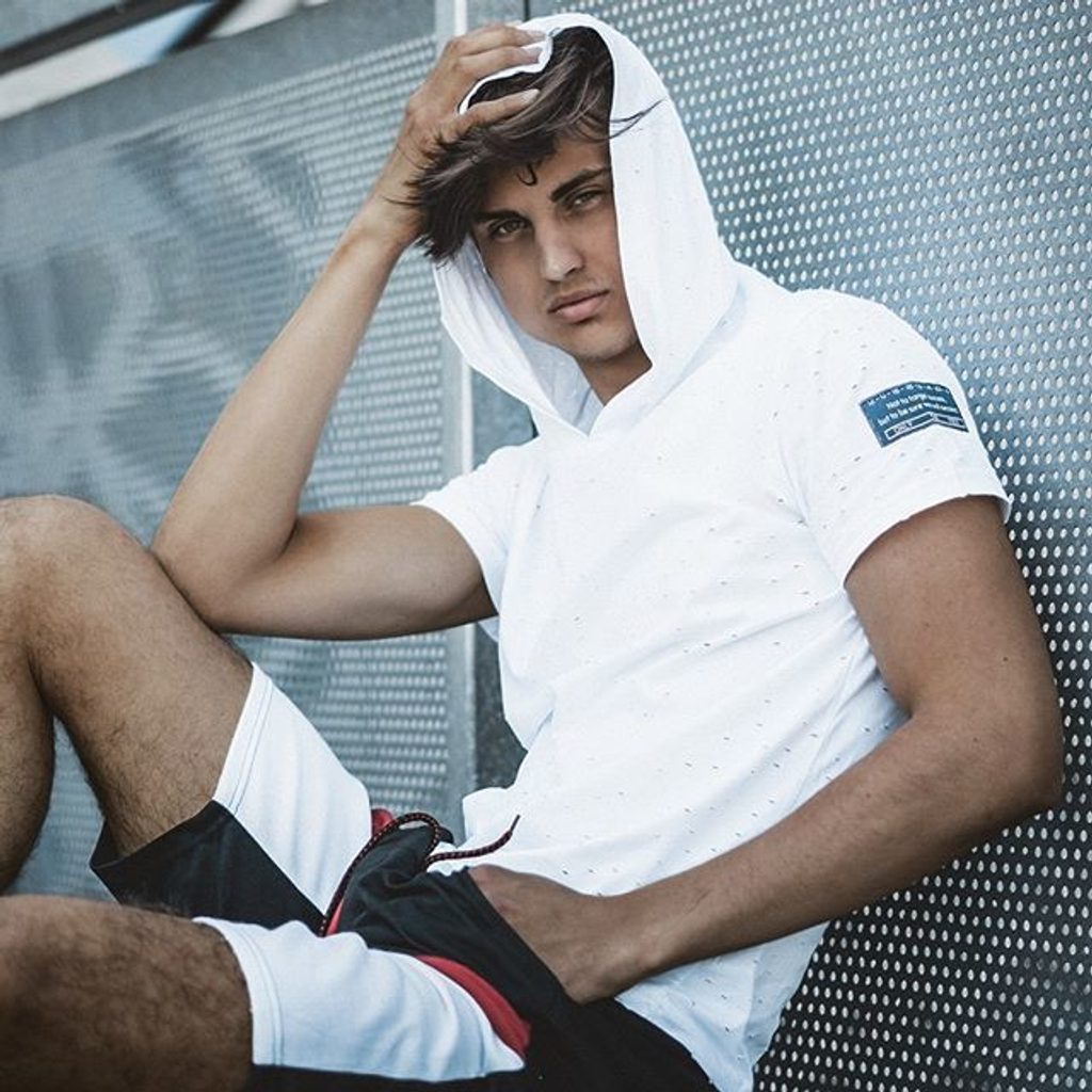 Kellemes pamut pólóanyagból készült kapucnis atléta. Fehér színben. Teljes felületén lyukacsos kivitelben. Hosszított szabású. Kényelmes, nagyon szellős nyári viselet. Az ujjakon, logós címke.