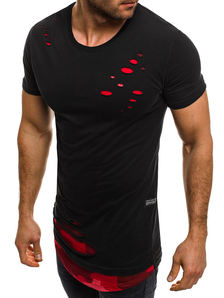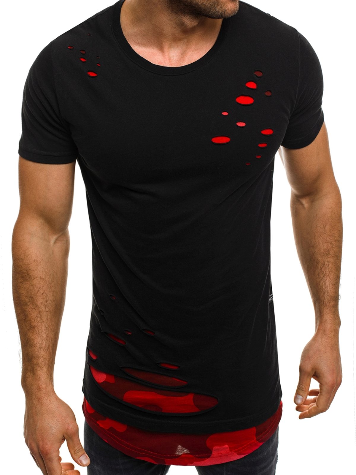 Ez egy lyukacsos fekete piros trendi póló. Nyáron biztosan mindenkinek jól jön egy a meleg napokra. Hosszított szabás, lekerekített allj terepmintás kivitelben. Anyaga rugalmas. Nagyon jól mutat farmernadrággal.