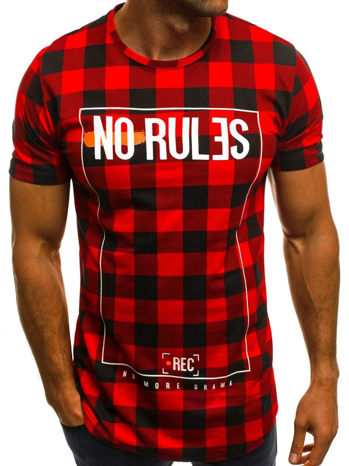 Kényelmes, modern fekete piros kockás mintás póló. Elül nyomtatott felirat. Kiváló minőségű, puha, rugalmas pamut anyagból készült. Klasszikus, enyhén testhezálló fazon, kerek nyakkivágással és rövid ujjakkal. Csípőig érő hossz.