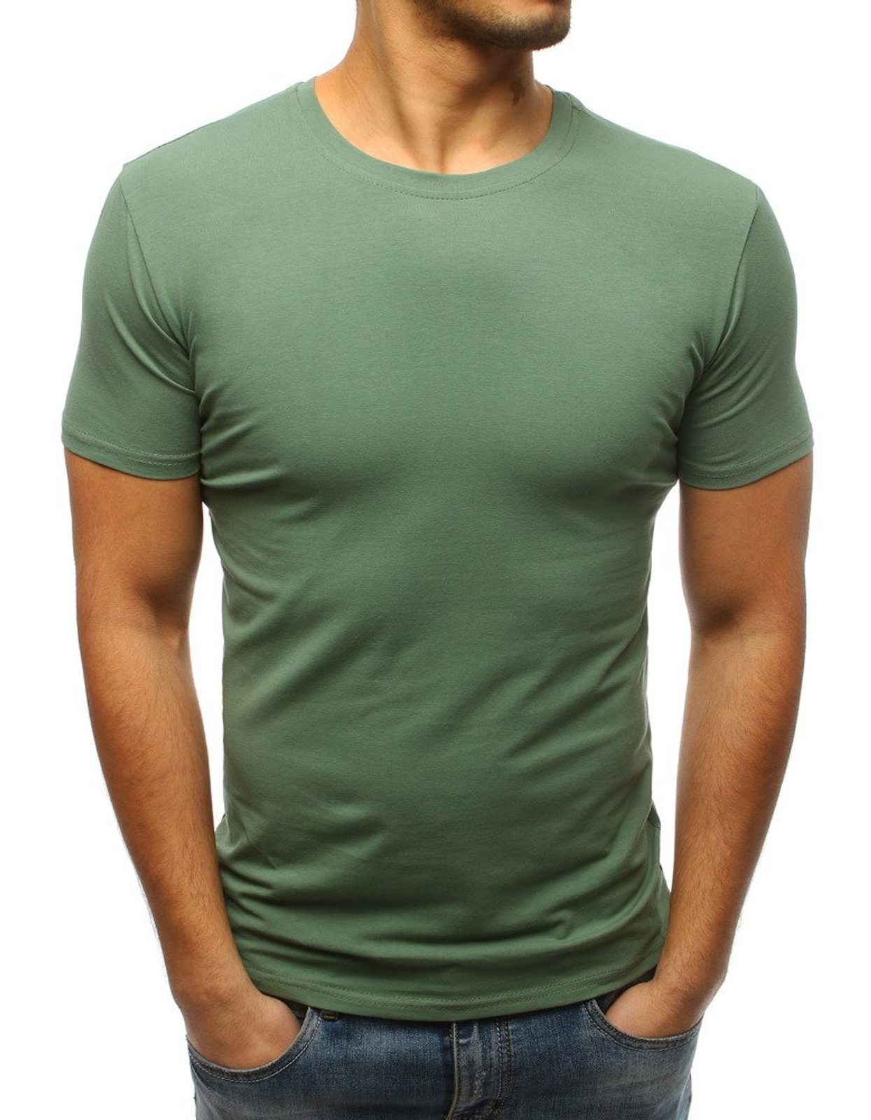 Egyszínű sima zöld póló. Kiváló minőségű, puha, rugalmas anyagból készült. Laza, egyenes vonalú fazon rövid ujjakkal és kerek nyakkivágással. Csípőig érő hossz. Klasszikus, enyhén testhezálló fazon.