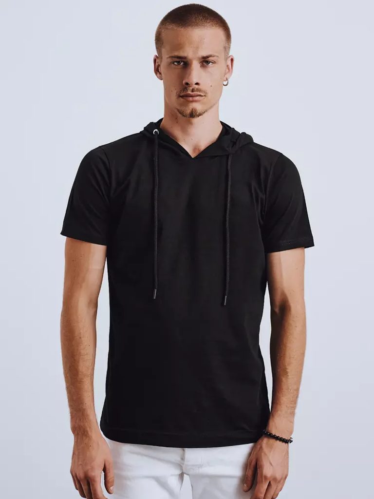 Fekete sima kapucnis póló, V nyakkivágás, zsinór behúzással. Kapucnival ellátva. Modern férfiak számára ajánlott, aki az aktív életformát vallja. Számos ruhadarabbal kombinálható lezser felső.