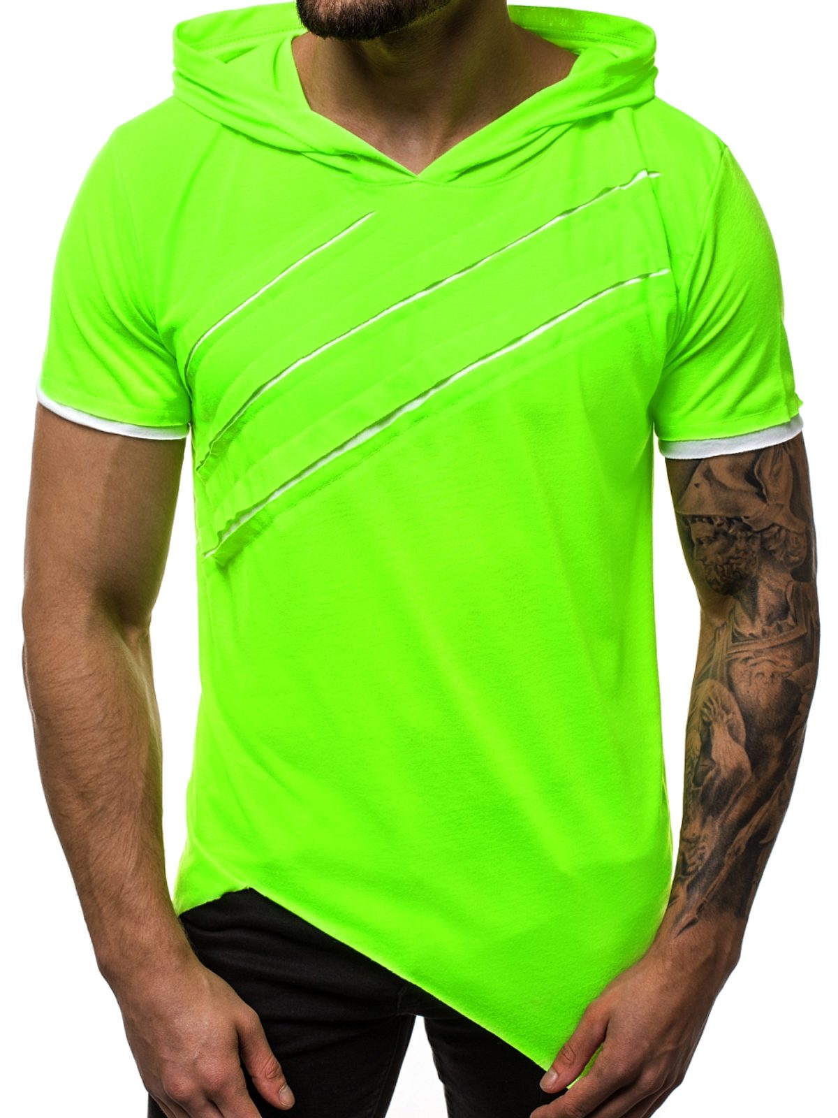 A legújabb divatnak megfelelő tépett zöld aszimmetrikus póló mely trendi megjelenést biztosít viselőjének. Tépett részekkel az elején. Laza kapucnis modell. Hétköznapi visleletre. Sok stílusos összeállításhoz. Nagyon jól kombinálható.