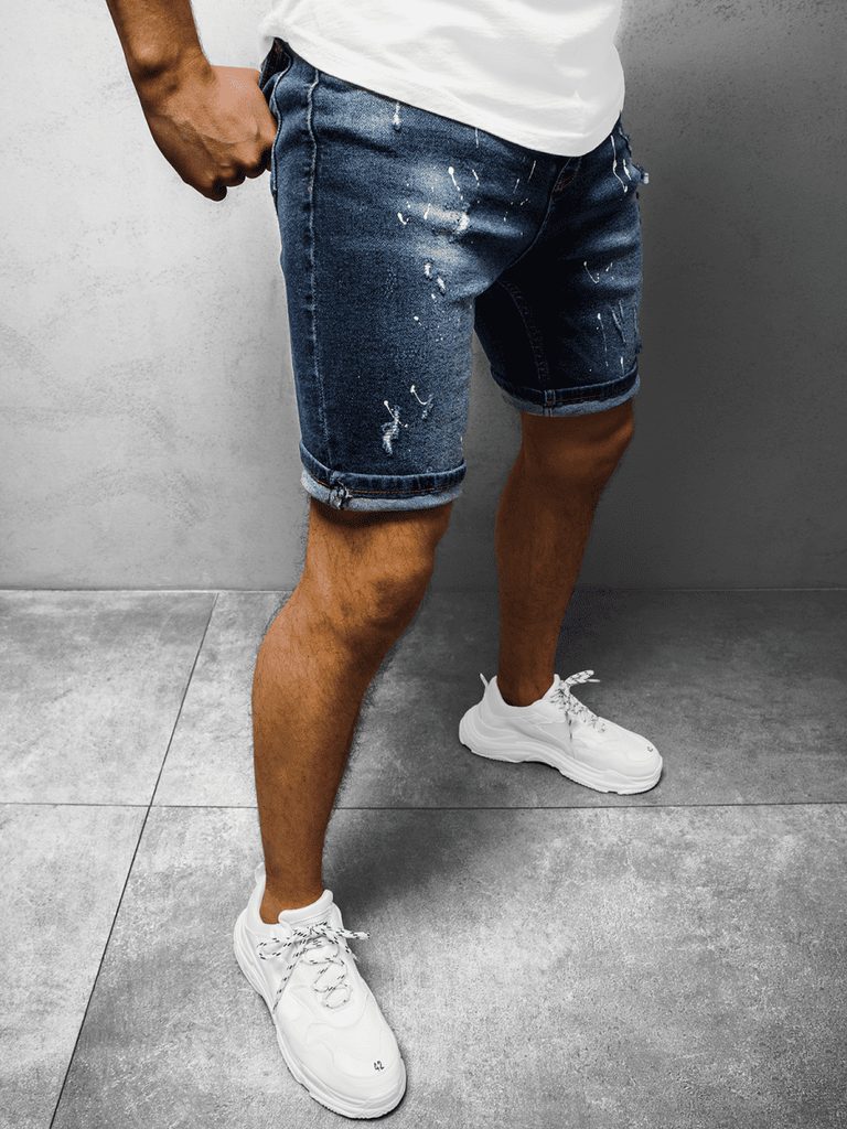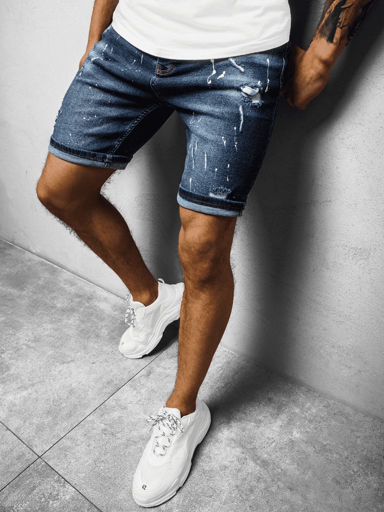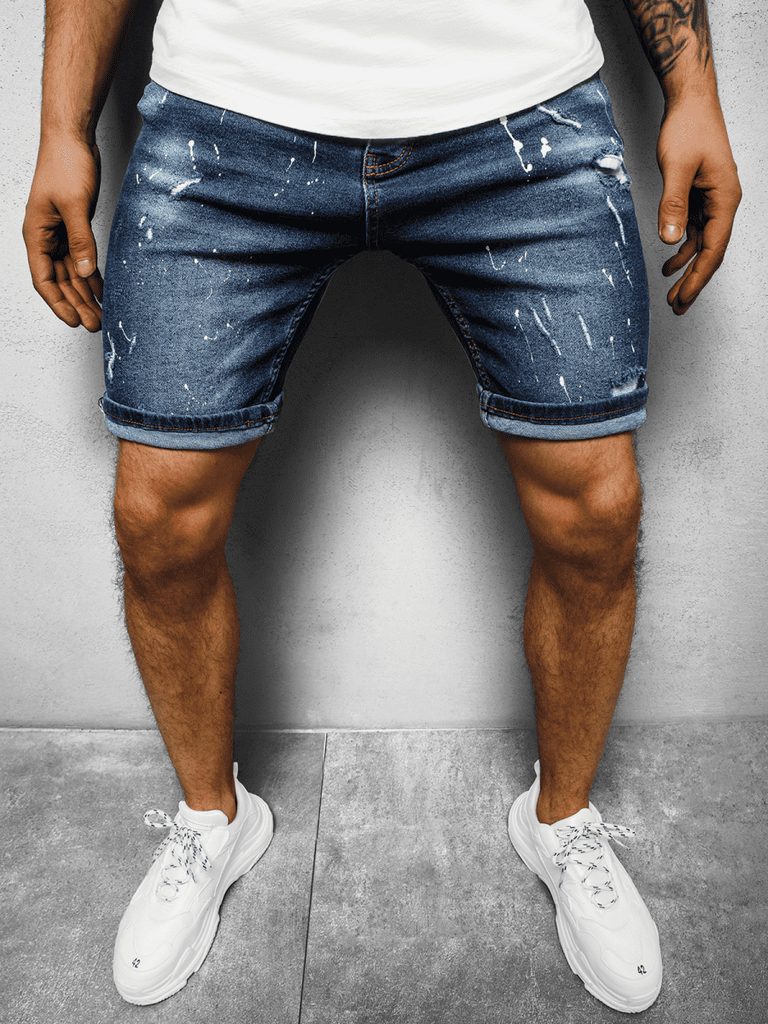 Trendi kék farmer rövidnadrág. Koptatott hatású. Elegáns, időtálló szabás. Kombináld ingel, pólóval és divatos vászon cipővel. Kétoldalt benyúlós zsebek, hátul két farzseb. Derékban integrált öv és övbujtatók. Vissza hajtott lábszár.
