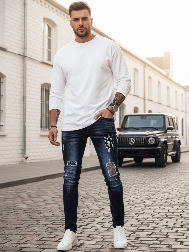 nagyszerű férfi farmer gombos rögzítés kúpos vágás díszítő karcolások, elemek nyomott szövettel bélelt horzsolások három elülső zseb két hátsó zseb ideális mindennapi viseletre Anyaga: 65,9% pamut, 30,1% poliészter, 2,5% viszkóz, 1,5% elasztán