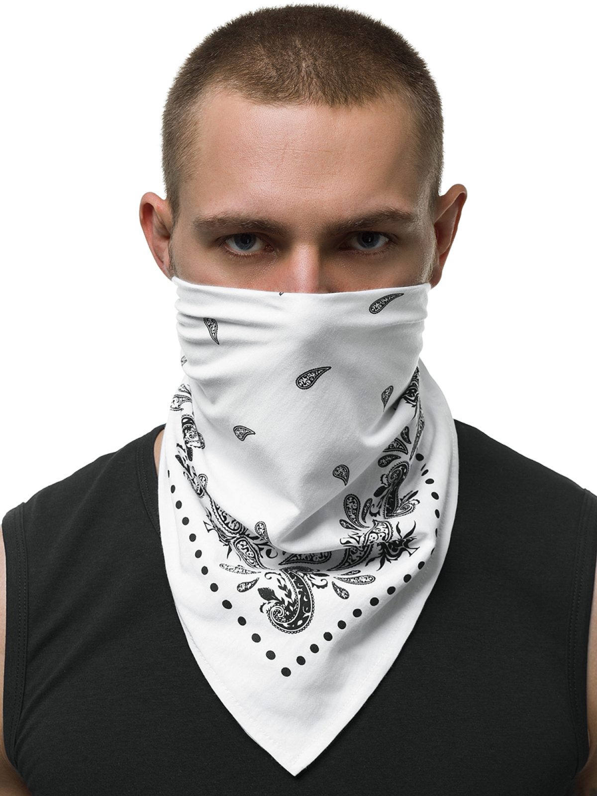 Stílusos szögletes bandana kendő. Ideális száj és nyakvédő anyaga miatt. Fekete alapon érdekes mintával. Szélesség 53cm