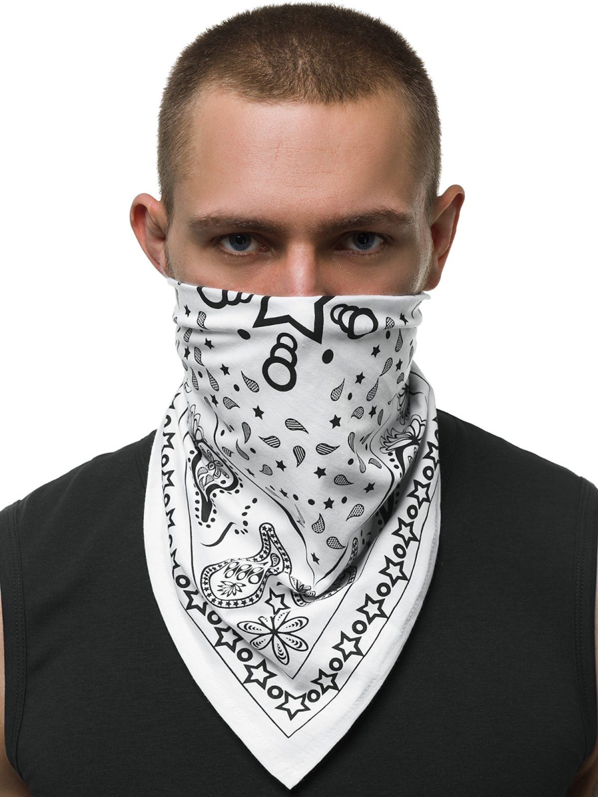 Stílusos szögletes bandana kendő. Ideális száj és nyakvedő anyaga miatt. Fehér alapon érdekes mintával. Szélesség 53cm