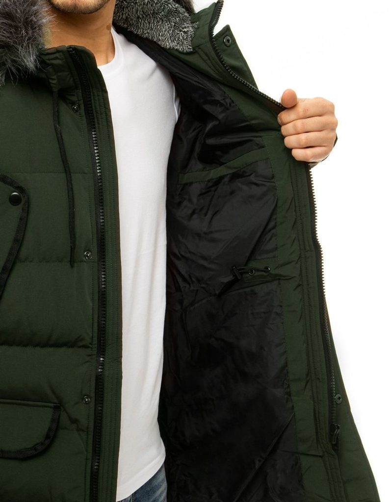 Kényelmes tél sötét zöld parka kabát, mindennapi viseletre. Téli időszakra. A kapucni szőrmés díszítéssel. A kapucni nem lekapcsolható. Hosszab fazonú, több zsebbel ellátva. Két zsebfedős zsebbel és két benyulós zsebbel. A derék bőség belső zsinórral szabályozható. Kapucnis fazon, mely műszőrmés gallérral van díszítve. Rejtett cipzár, kívül patent gombbal ellátva. Nagyon divatos, meleg téli kabát. Viselője nem fog fázni benne.