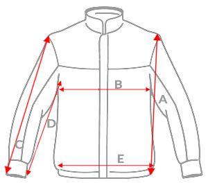| Méret | Hossz A | mell szélesség B | Külső ujjhossz C | Belső ujjhossz D | Alsó szélesség E |