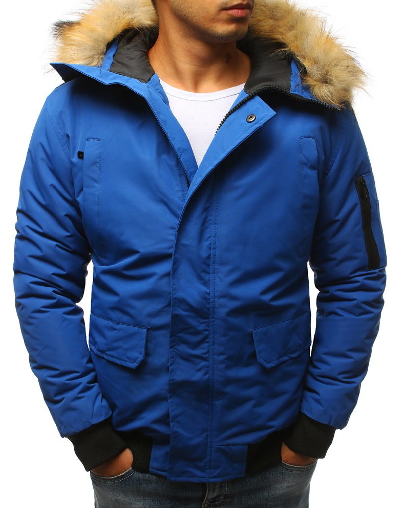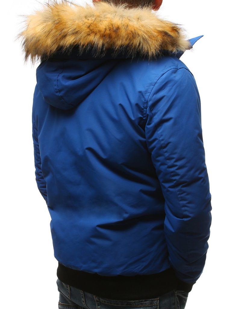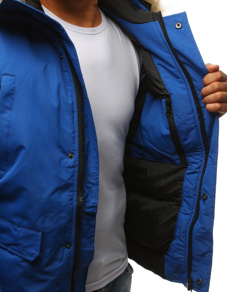 Kék téli kabát. Különféle zsebek és részletek. Rejtett cipzár és patent gomboláspánt. Kontrasztos kapucnibélés és szegély. Levehető műszőrme gallérral. Hétköznapi viseletre.