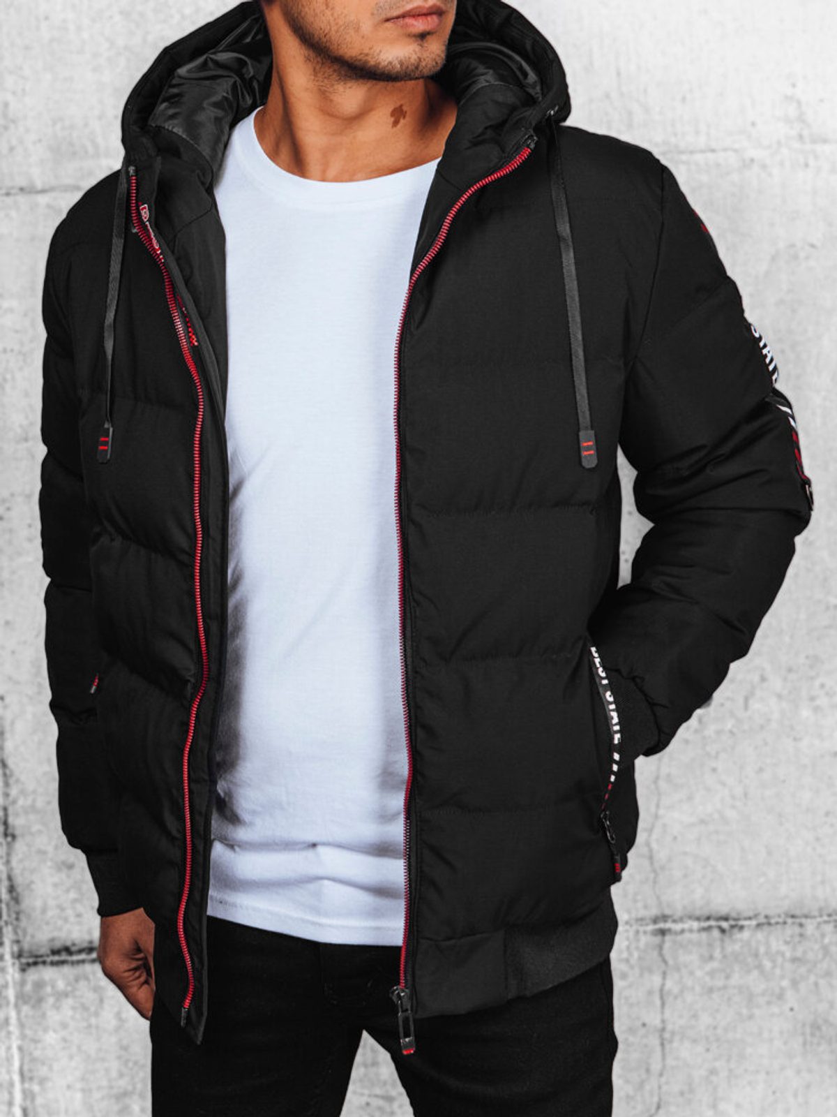 vonzó téli férfi steppelt kabát cipzáros rögzítés húzózsinórral állítható levehető kapucni két külső cipzáras zseb egy belső zseb az ujjak és a kabát alsó része praktikus mandzsettával zárva a kabát béléssel rendelkezik kényelmes vágás anyaga: 100% poliészter