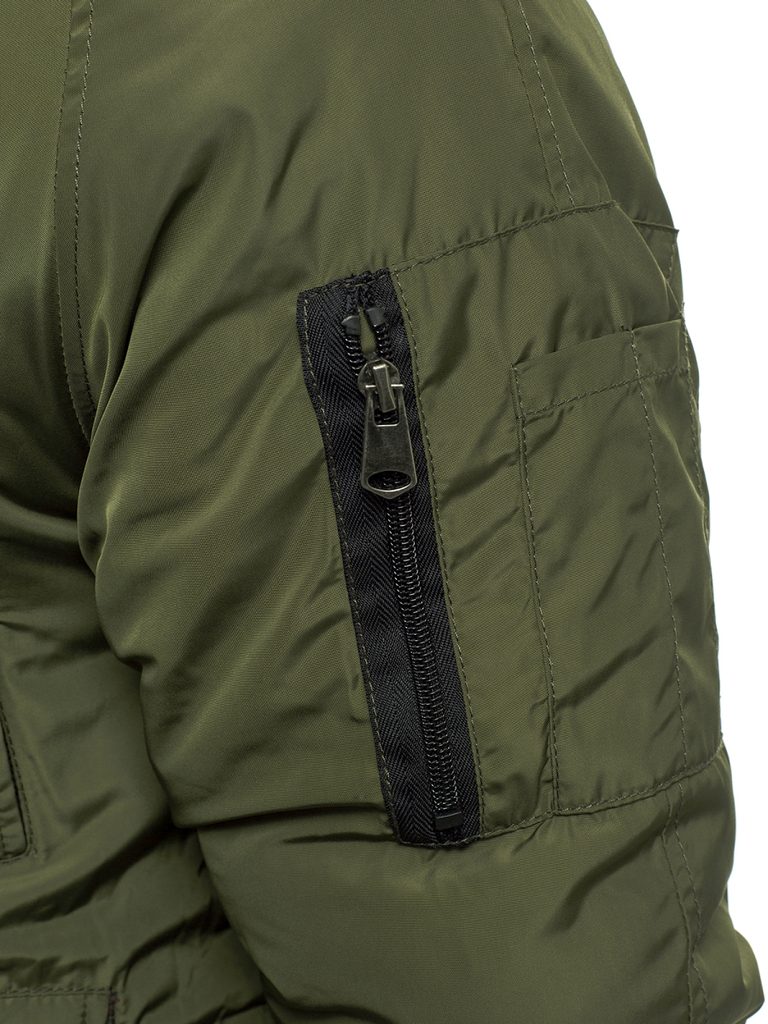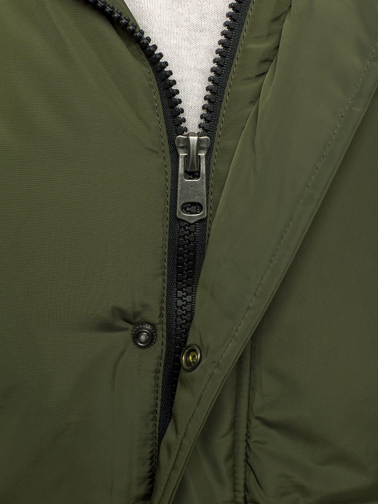Téli férfi bomber dzseki. Kapucnis fazon, lekapcsolható szőrmével. Ujjain és alján formatartó, bordás kötésű fekete szegőpánttal. Dupla zárással. Cipzáras és gombos zárás. Elül négy zsebbel van ellátva, egy belső zseb. Minőséges alapanyagból készült. Téli időszakra nagyon megfelelő.