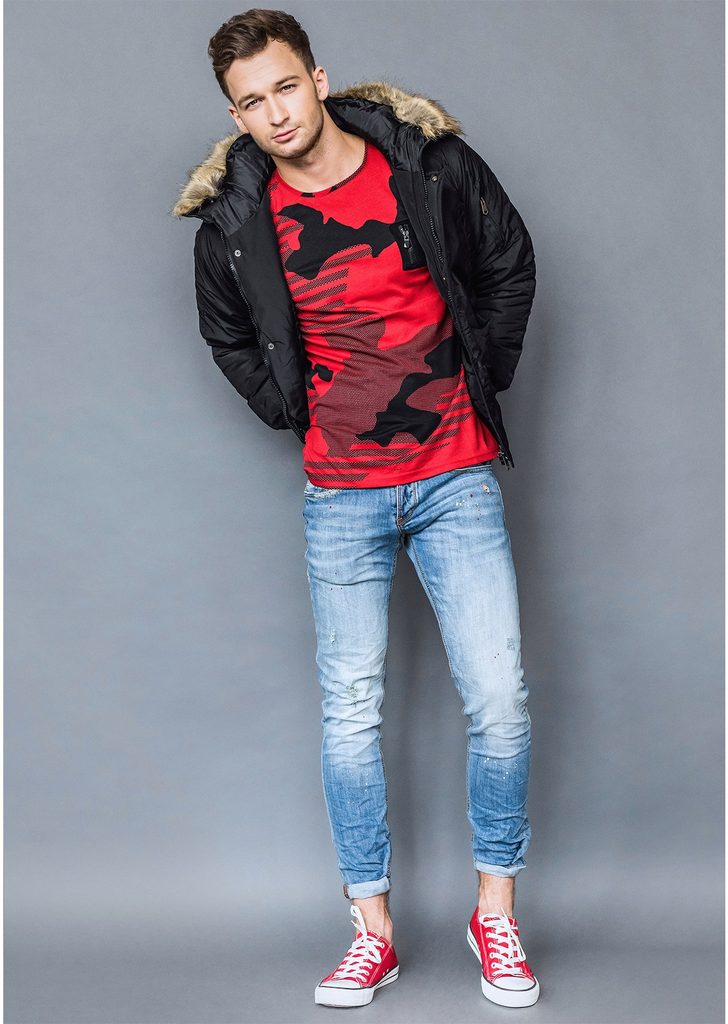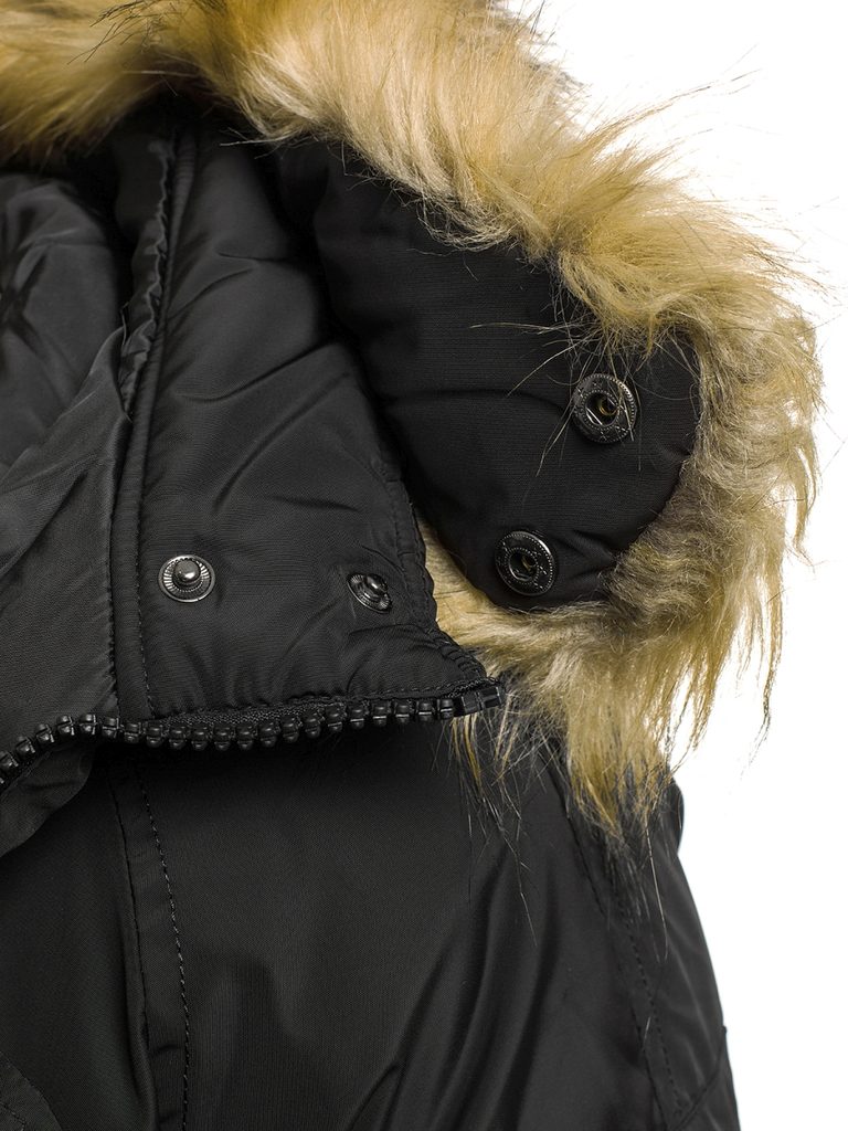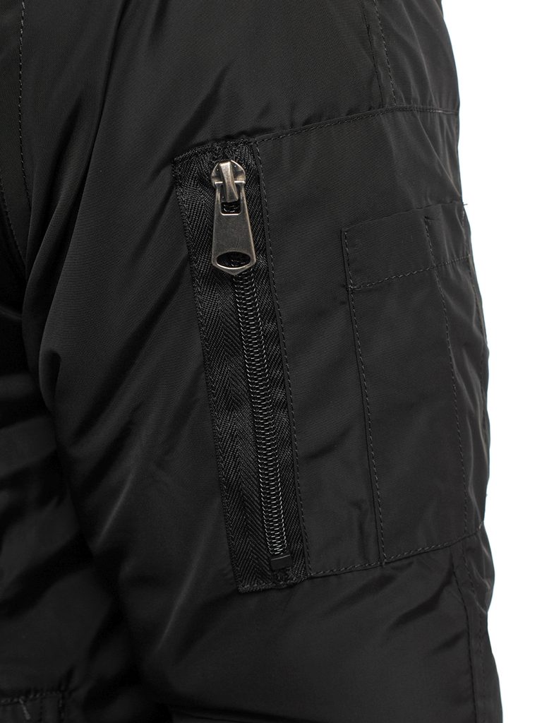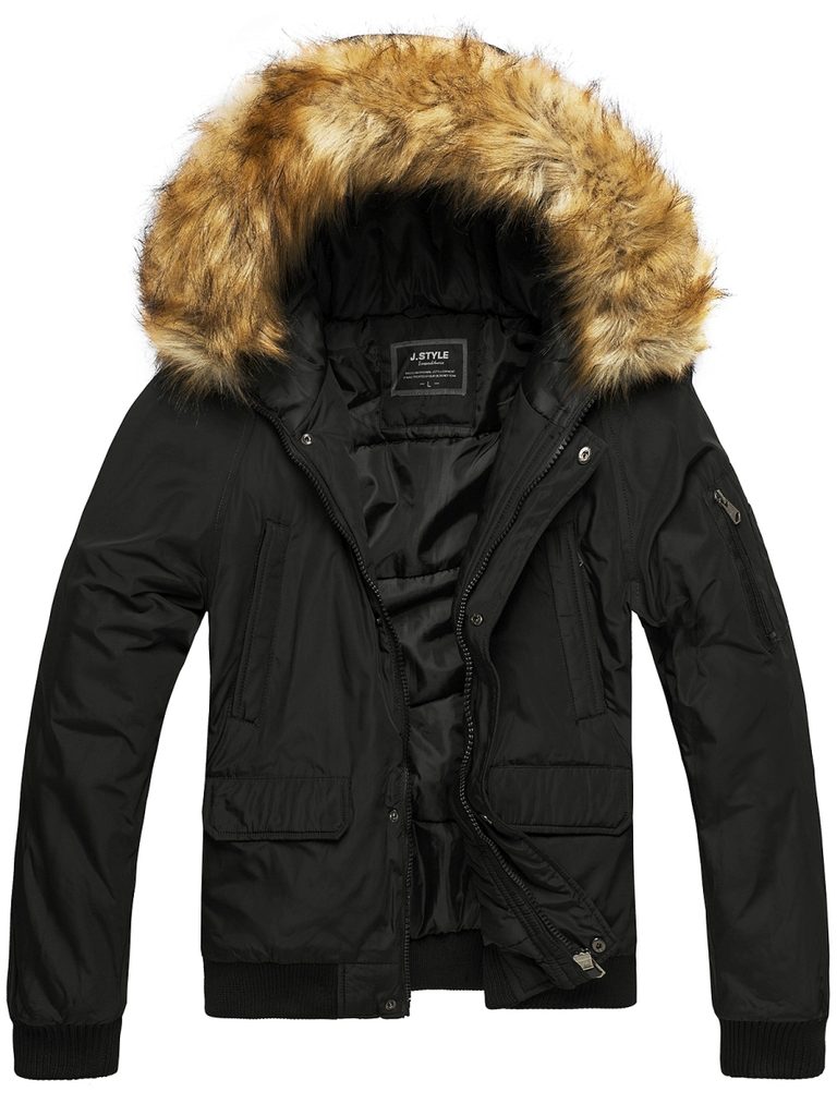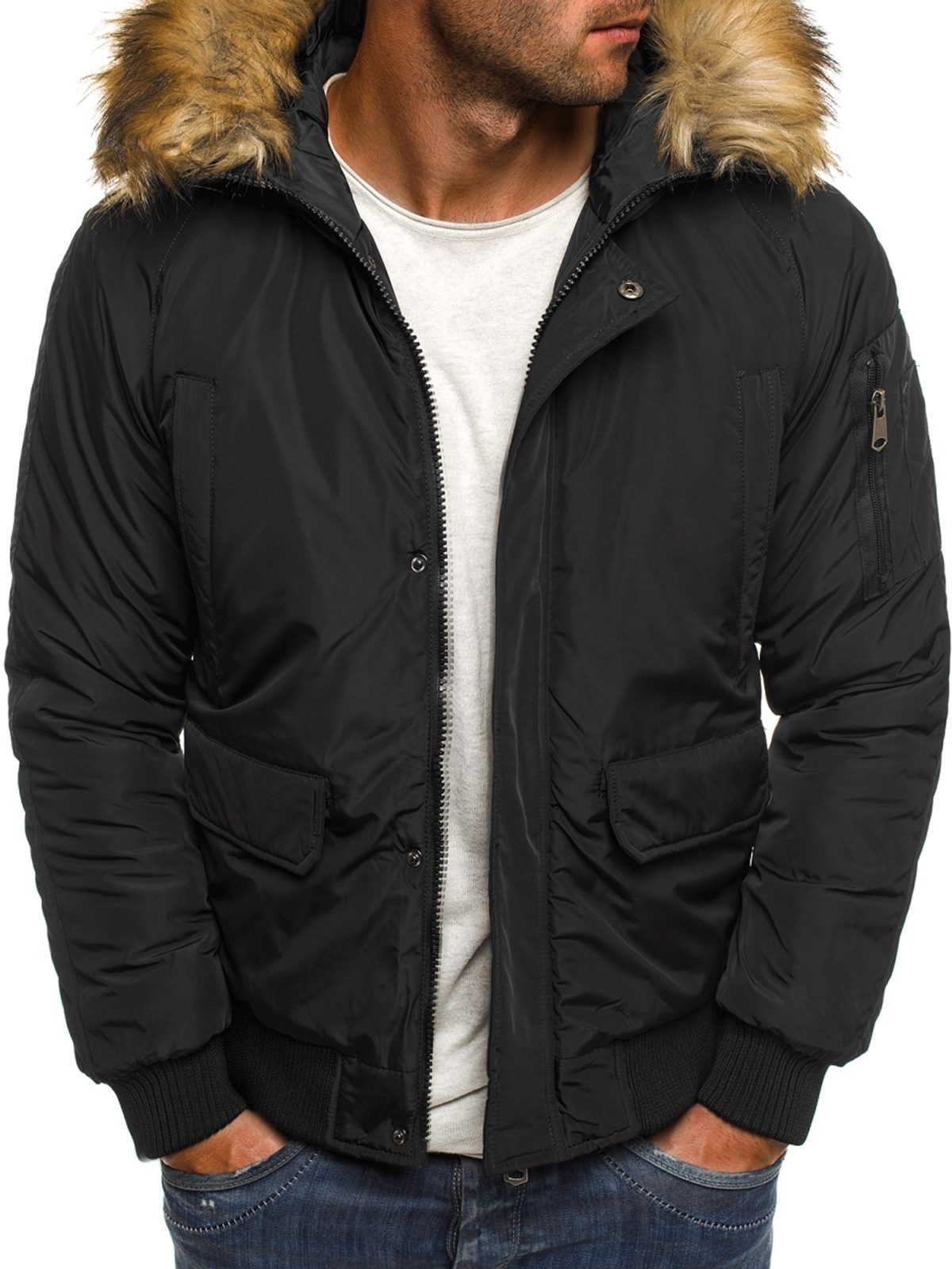 Téli férfi bomber dzseki. Kapucnis fazon, lekapcsolható szőrmével. Fekete színű. Ujjain és alján formatartó, bordás kötésű fekete szegőpánttal. Dupla zárással. Cipzáras és gombos zárás. Elól négy zsebbel van ellátva, egy belső zseb. Minőséges alapanyagból készült. Téli időszakra nagyon megfelelő.