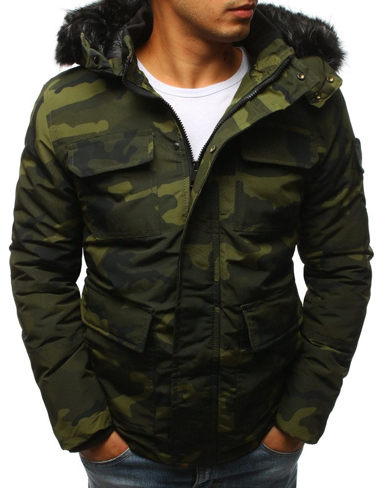 Látványos téli zöld színű parka, mindennapi viseletre. Téli időszakra. A kapucni szőrmés díszítéssel, mely lekapcsolható. Hosszab fazonú, elején hat zsebbel ellátva. Egy belső zseb. Kapucnis fazon, mely műszőrmés gallérral van díszítve. Rejtett cipzár, kívül patengombokkal ellátva. Nagyon divatos, meleg téli kabát. Viselője nem fog fázni benne.